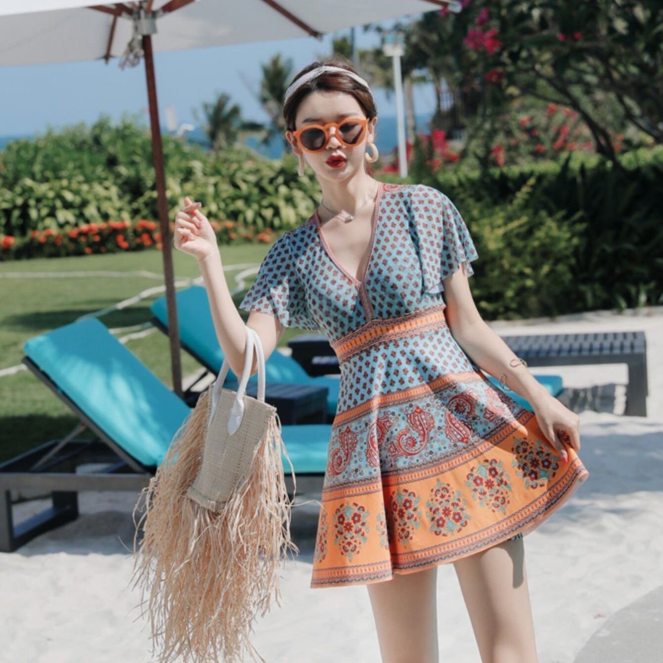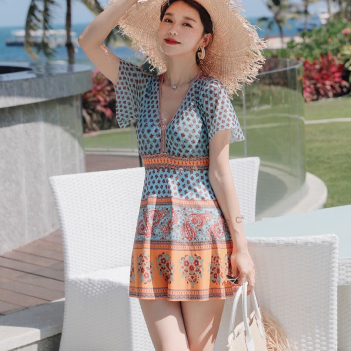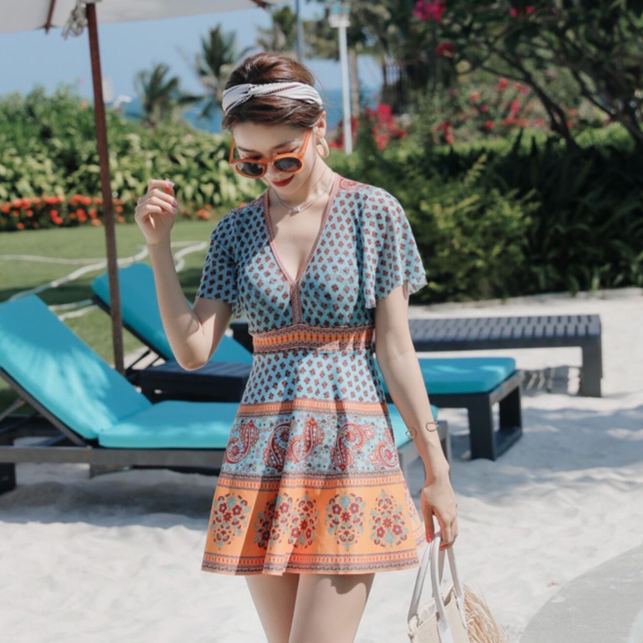 水着 ワンピース水着 ワンピース 体系カバー 半袖 ハイウエスト 谷間 谷間魅せ フレアスカート 大人可愛い カジュアル ゴージャス 大人っぽい おしゃれ 存在感 個性的 モード系 スタイリッシュ アジアン 柄 パターン柄 20代 30代 40代 レディース ママ 体系カバー 二の腕カバー 美脚 脚長 スタイルアップ 美スタイル 格上げ インスタ映え サイズ豊富 色展開 オレンジブロッサム