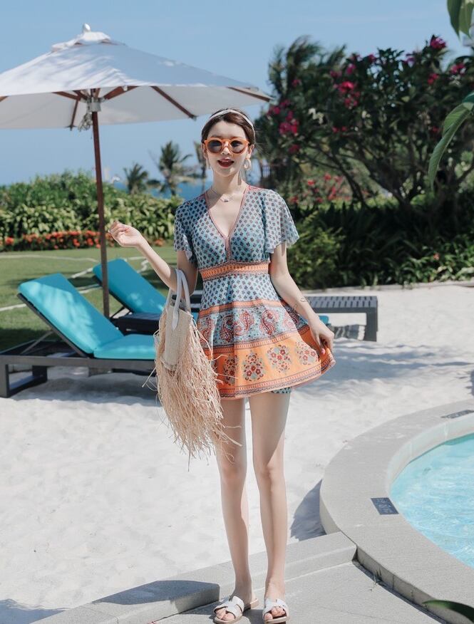 大きめサイズにも対応しているのが嬉しい◎深Vネックでしっかり谷間を綺麗にバストを盛ってくれますよ。アジアンテイストなプリントが個性的で、人とかぶらないデザインです。サンダルやバッグも同じ雰囲気で合わせてみてもかわいいですよ。