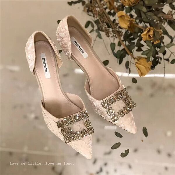 大きなスクエアのビジューが印象的ヒールパンプス。