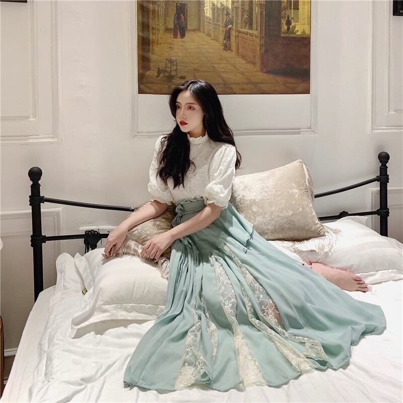 ドレスワンピ カントリー パーティードレス 二次会ドレス ロングドレス 演奏会ドレス 発表会ドレス アンクル丈 袖あり 半袖 パフスリーブ 襟付き スタンドカラー Aライン セパレート 上下セット プリーツ レース 刺繍 ウエストリボン ハイウエスト かわいい 大人可愛い きれいめ 上品 おしゃれ 大人女子 ラブリー キュート エレガント 主役級 ゴージャス 華やか おしゃれ 主役級 お姫様 お嬢様 チャイナ風 柄 花柄 20代 30代 レディースレストラン 美脚 インスタ映え 春 秋 ミントグリーン