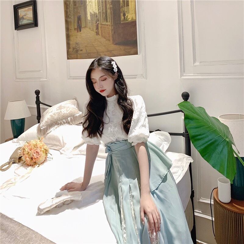 中国風スタイルで、カントリーっぽくもあるセパレートドレスです。ふんわりパフスリーブで、お嬢様っぽい着こなしが楽しめますよ。お呼ばれのパーティ、二次会、アフタヌーンティなど、優雅なひと時を過ごす時にはぴったりです。