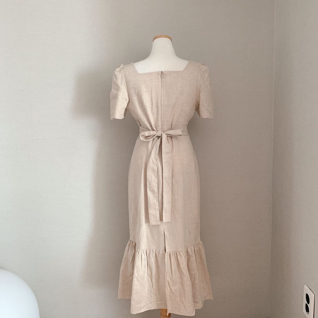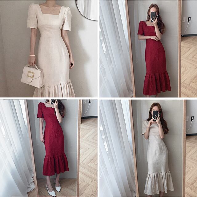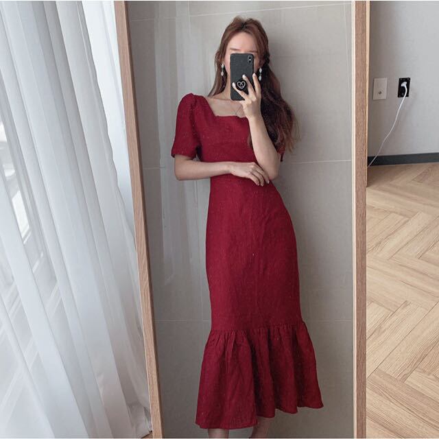マーメイドワンピ ワンピース ワンピドレス ミモレ丈 袖あり 半袖 スクエアネック バックリボン ハイウエスト かわいい きれいめ シンプル 大人 上品 大人可愛い こなれ感 存在感 無地 春 夏 20代 30代 40代 レディース 女性用 デート お出かけ 休日 普段使い S M L 赤 レッド アプリコット