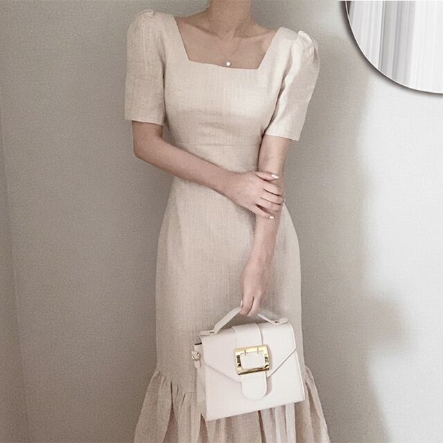スクエアネックで華奢見え効果。裾のふわっとしたデザインで可愛さをプラス。