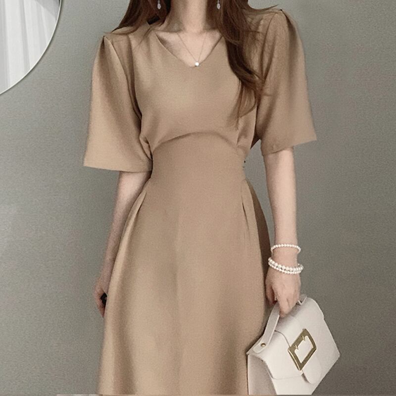 ワンピース 袖あり 半袖 Vネック Aライン ウエストマーク ハイウエスト ポリエステル きれいめ シンプル 大人 上品 大人女子 こなれ感 フォーマル とろみ感 無地 春 夏 秋 入学式 入園式 卒業式 卒園式 謝恩会 二次会 20代 30代 40代 レディース 女性用 ママ デート お出かけ 休日 普段使い 重ね着 楽ちん XS S M L XL カーキ アプリコット