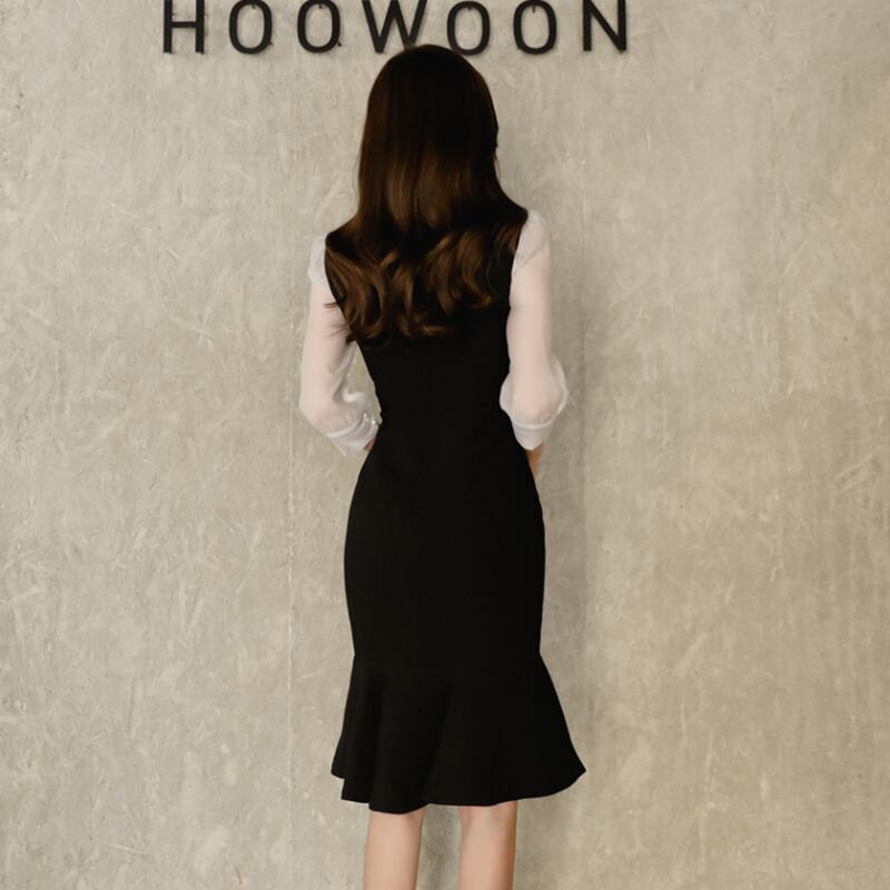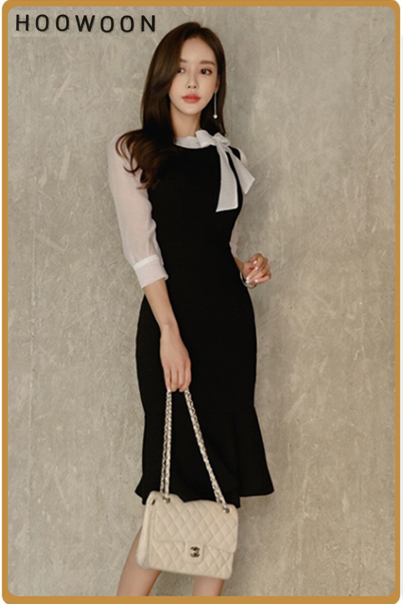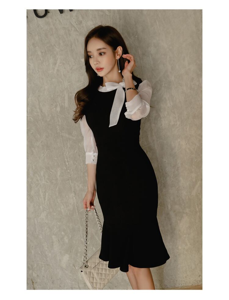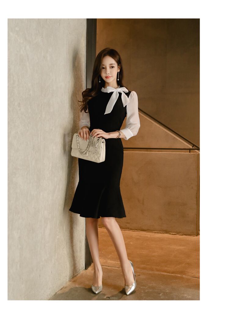 エレガントなモノトーンワンピに首元のリボンでアクセントをつけた人気デザイン。