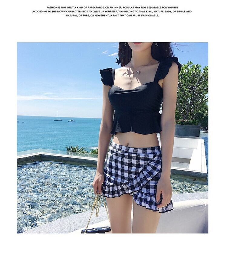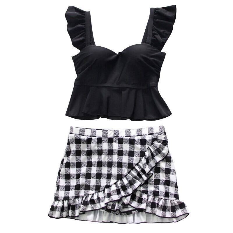 水着 ビキニ ショート丈 ノースリーブ スクエアネック シフォン フリル ウエストゴム 上下セット 2点セット ツーピース 大人可愛い シンプル カジュアル お洒落 大人女子 ラフ ラブリー キュート 無地 チェック柄 夏 10代 20代 30代 レディース 女性用 OL 学生 デート お出かけ 休日 運動 リゾート 旅行 海 プール 着回し 体系カバー M L XL 黒 ブラック 緑 グリーン オレンジ