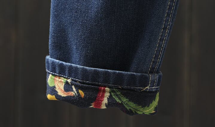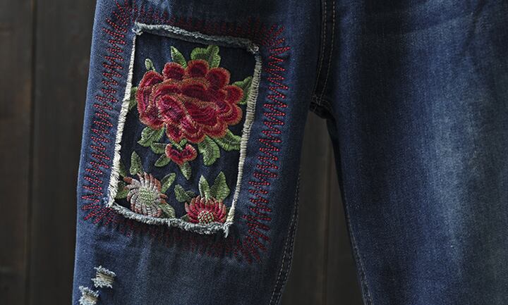 大胆な花柄の刺繍がパッと目を惹く、個性派デニムパンツ。