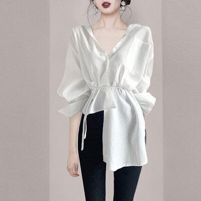 オーバーサイズシャツ トップス シャツ ブラウス 袖あり 長袖 Vネック 襟付き アシンメトリー シフォン ウエストマーク ウエストリボン 前開き かわいい 大人可愛い きれいめ シンプル カジュアル 大人 上品 おしゃれ お洒落 大人可愛い 大人女子 こなれ感 キュート ガーリー モダン 主役級 存在感 無地 春 秋 10代 20代 30代 レディース OL 通勤 学生 通学 デート お出かけ 女子会 休日 着回し 普段使い 重ね着 韓国系 オルチャン サイズ S M L XL 色展開 白 ホワイト