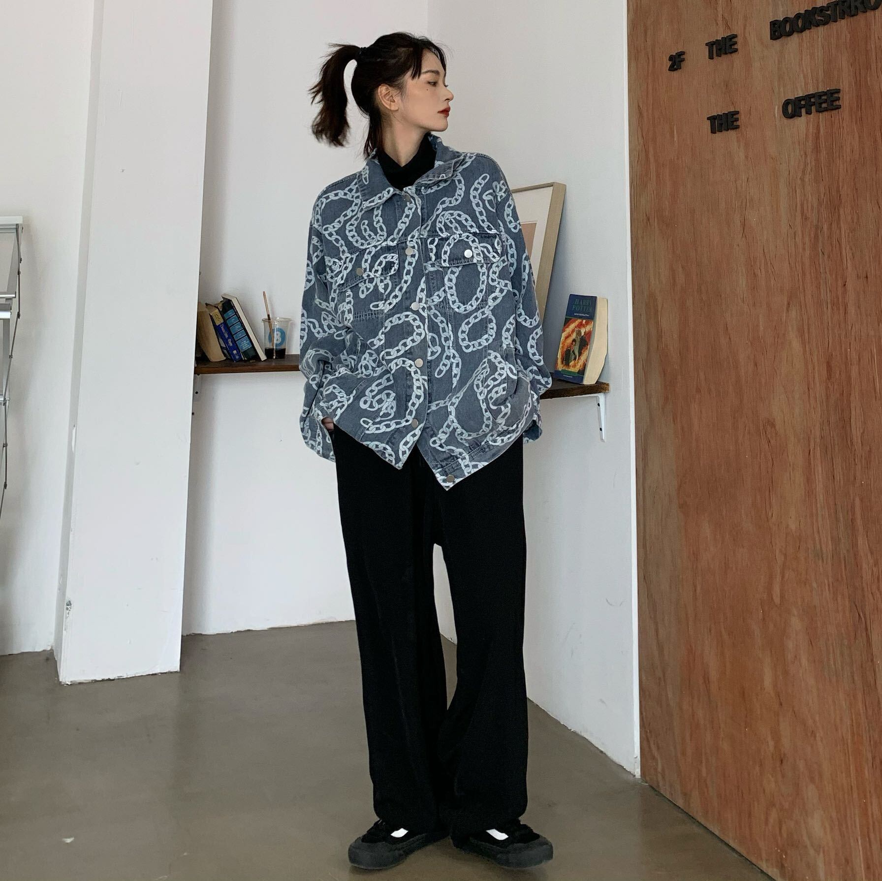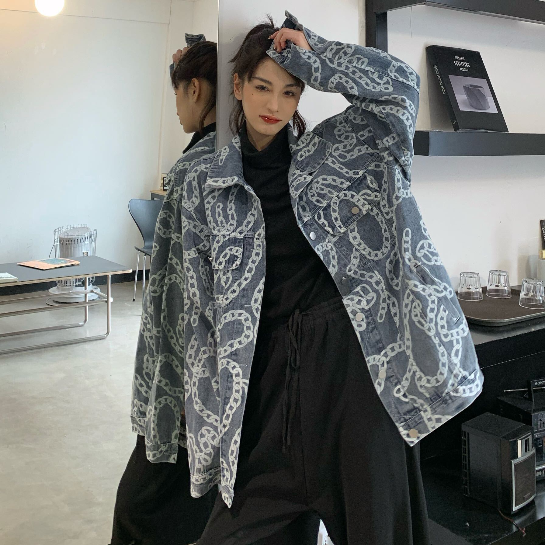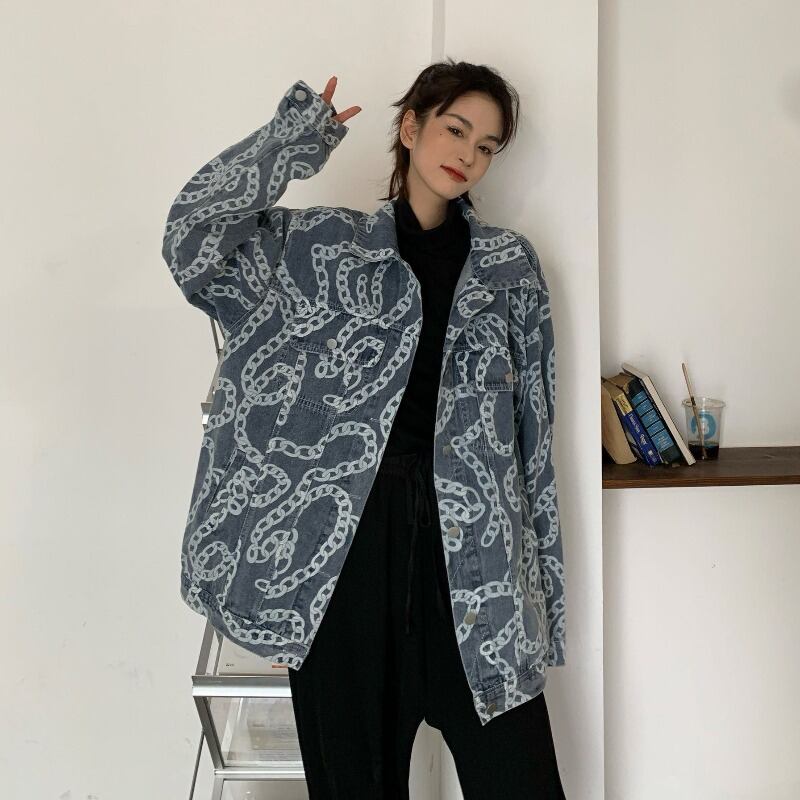 チェーン柄がおしゃれなオーバーサイズデニムジャケット。