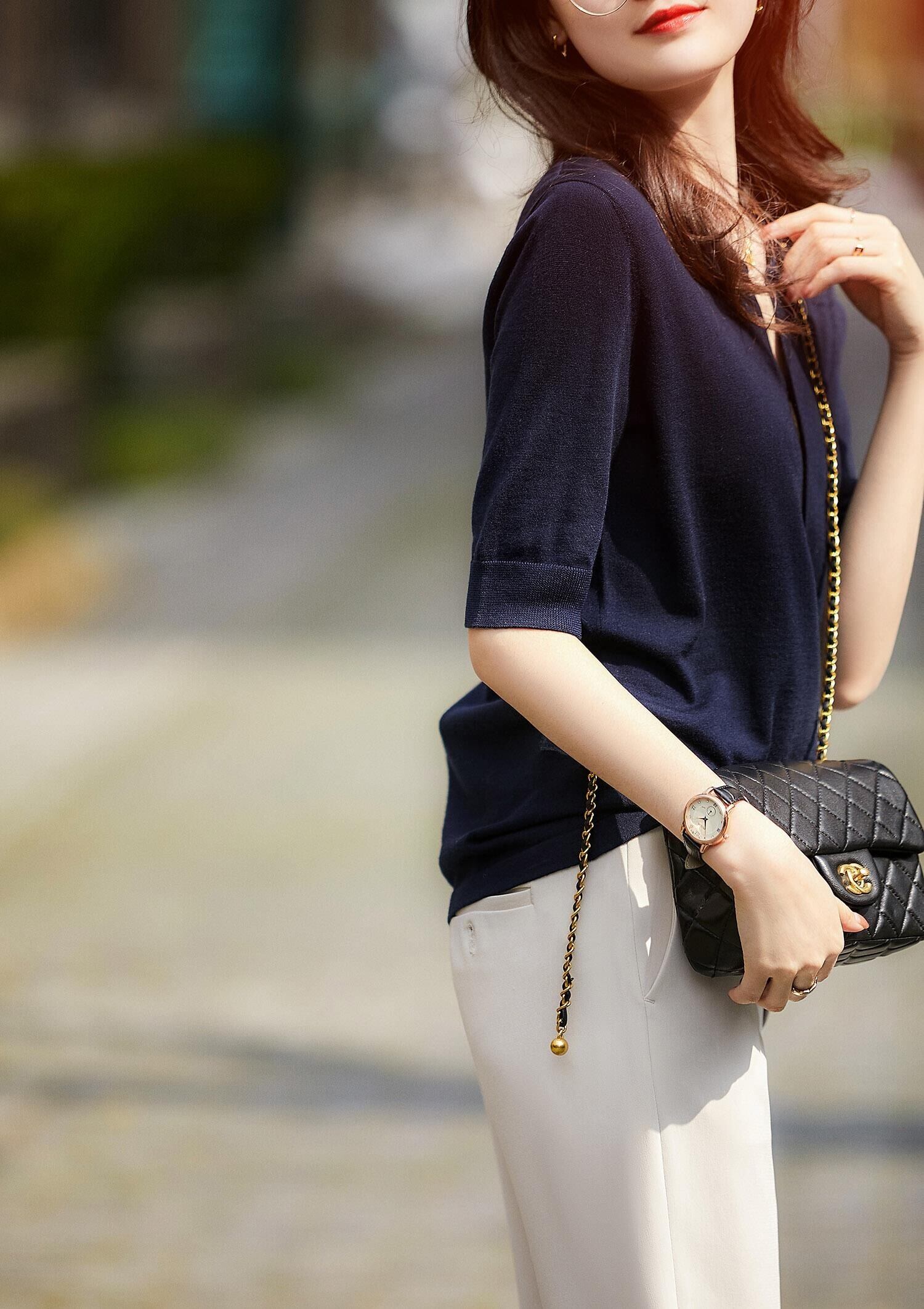 Vネックとすっきりとした袖が華奢見え効果を叶えます。