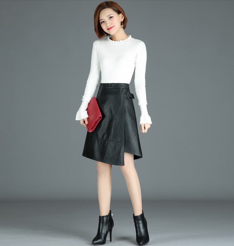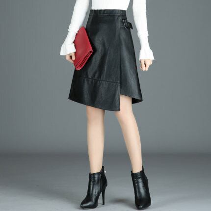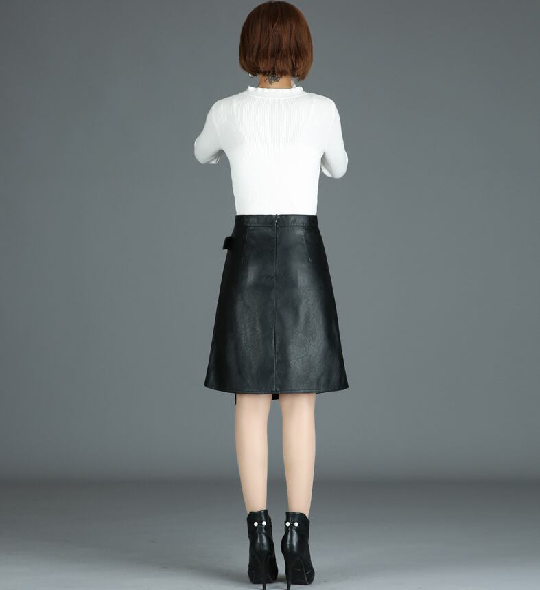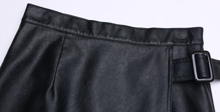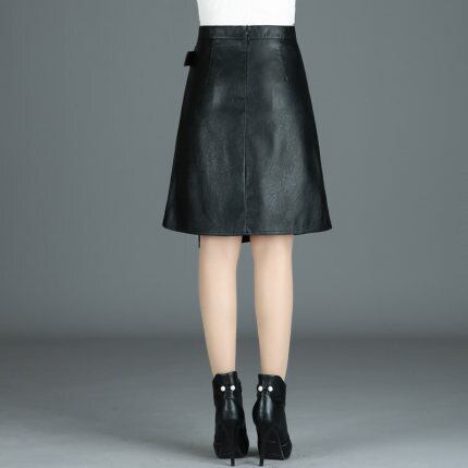 フェイクレザーを使用したミドルレングスのスカート。
