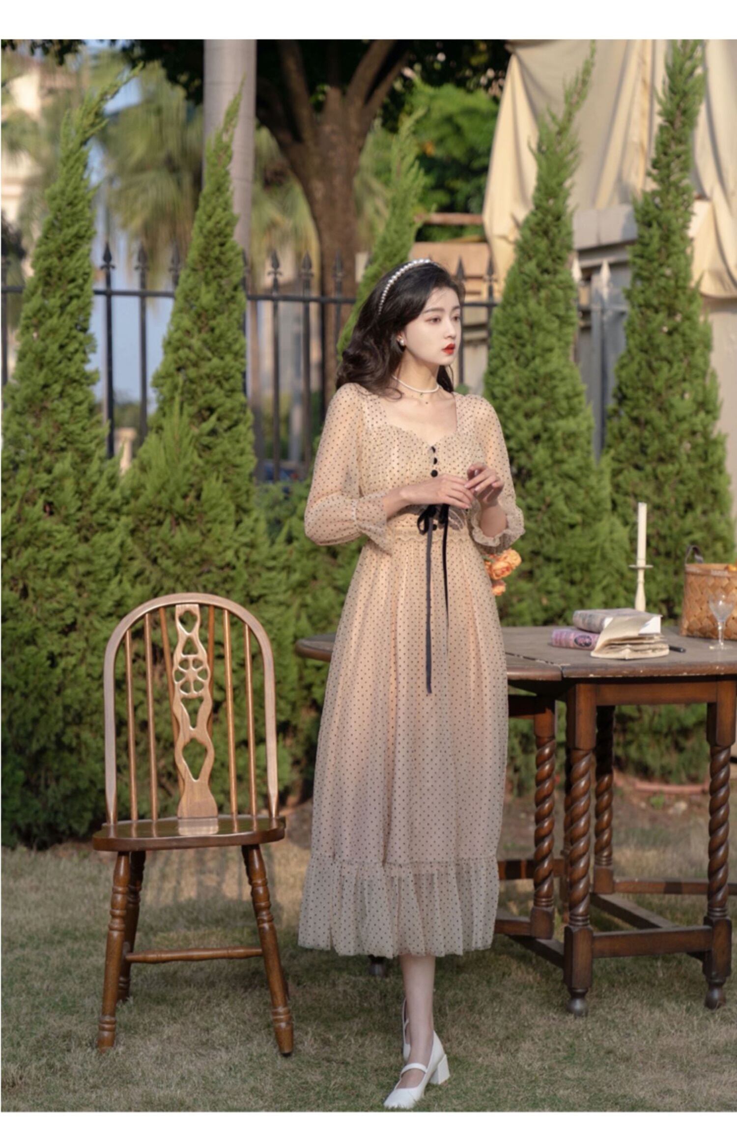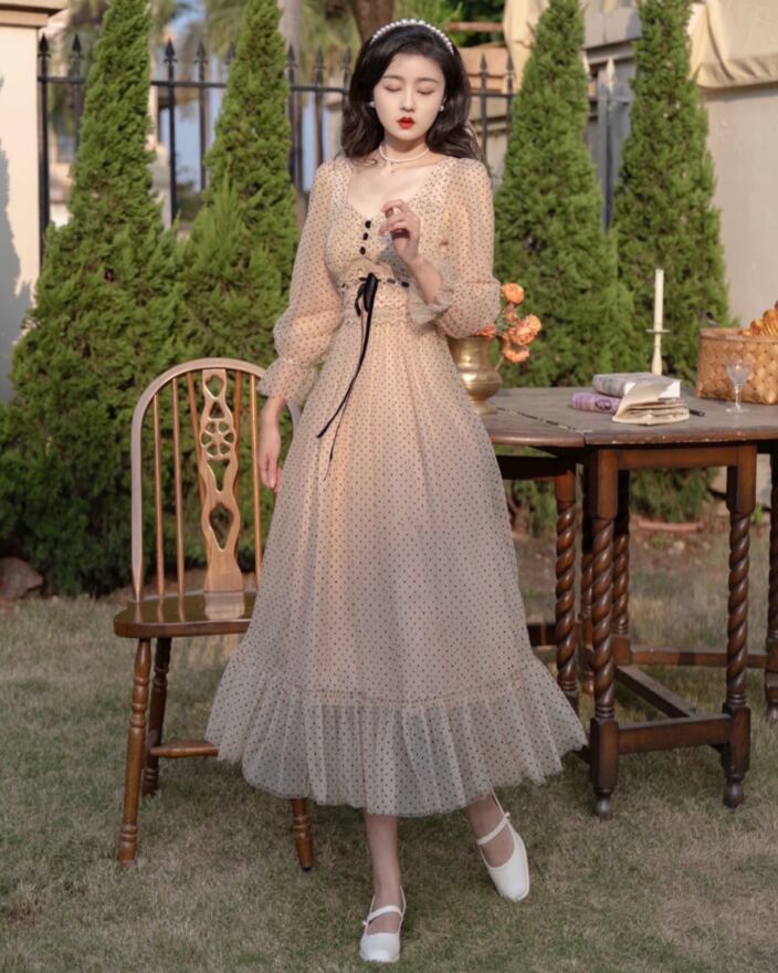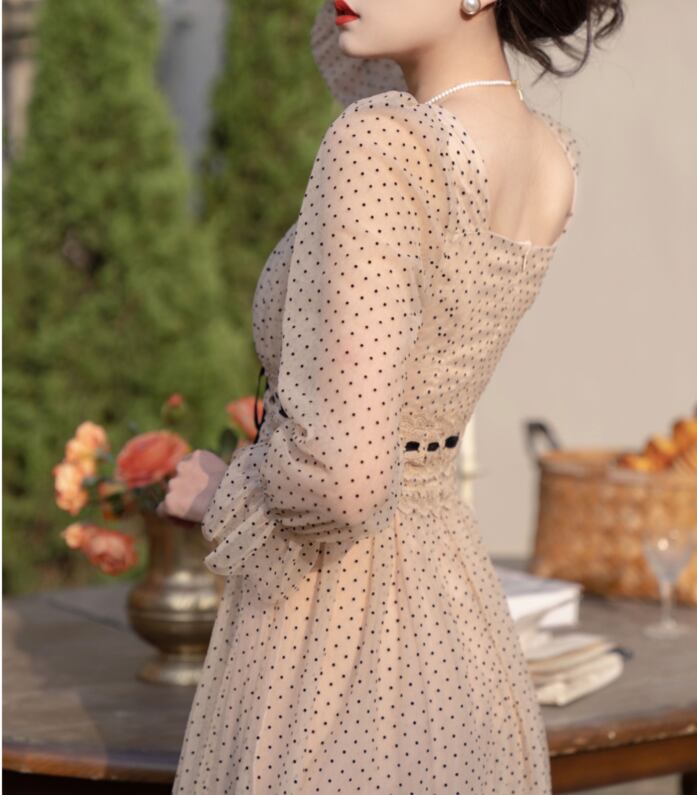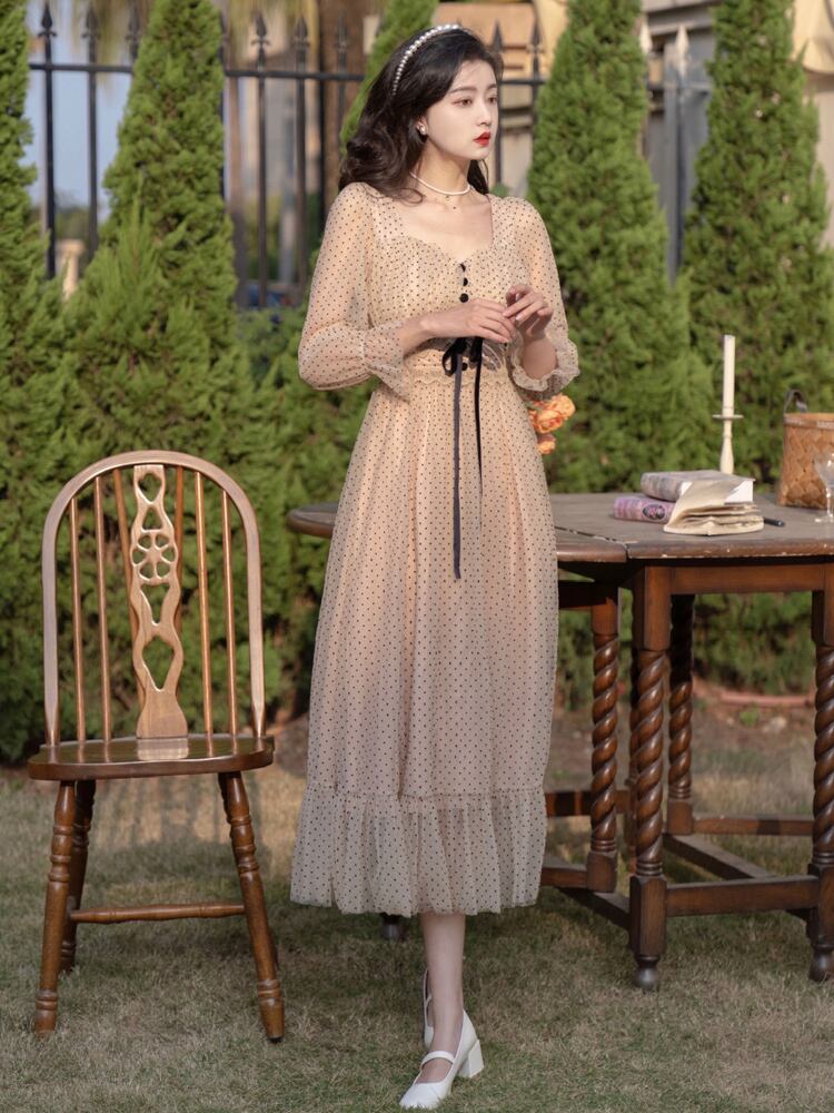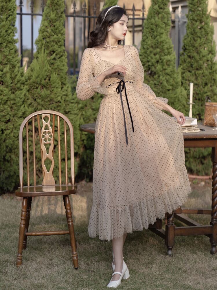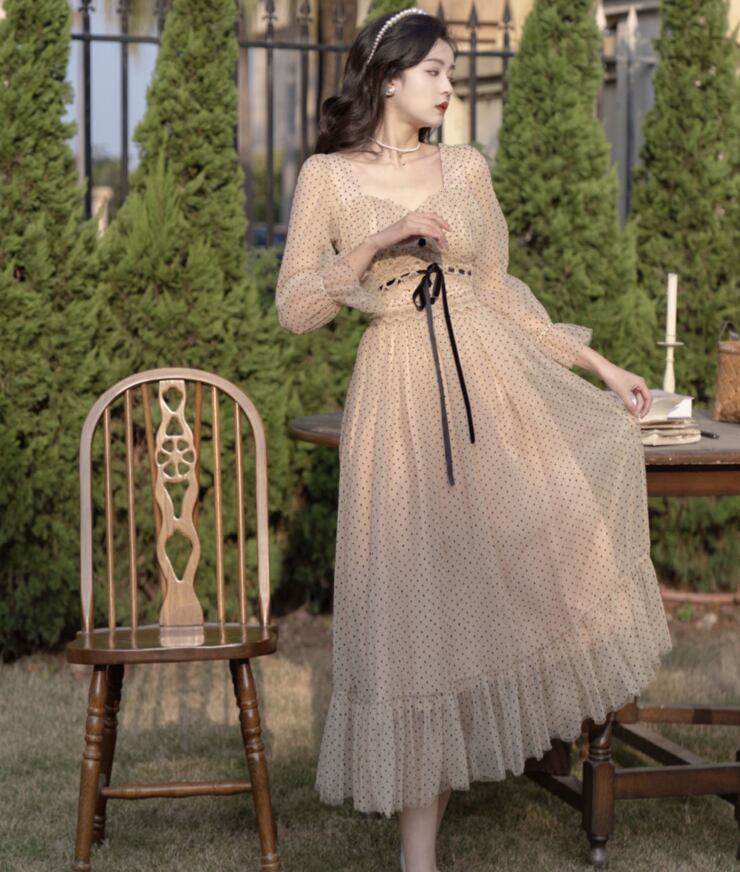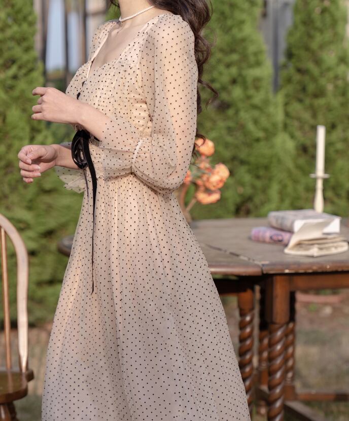 ドット柄ワンピース ワンピース フレアワンピース ワンピドレス ロング ロング丈 袖あり 長袖 Vネック フレア シフォン リボン ウエストマーク ハイウエスト 透け感 シースルー ポリエステル かわいい 大人可愛い きれいめ シンプル カジュアル 大人 上品 おしゃれ お洒落 かっこいい レトロ 大人可愛い 大人女子 こなれ感 キュート ガーリー エレガント モダン 主役級 存在感 柄 ドット柄 水玉 春 秋 10代 20代 30代 レディース 学生 通学 デート お出かけ 女子会 休日 着回し