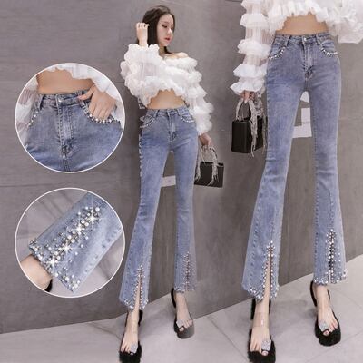 脚長・美脚効果の期待できるハイウエストのフレアデニムパンツ。