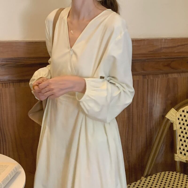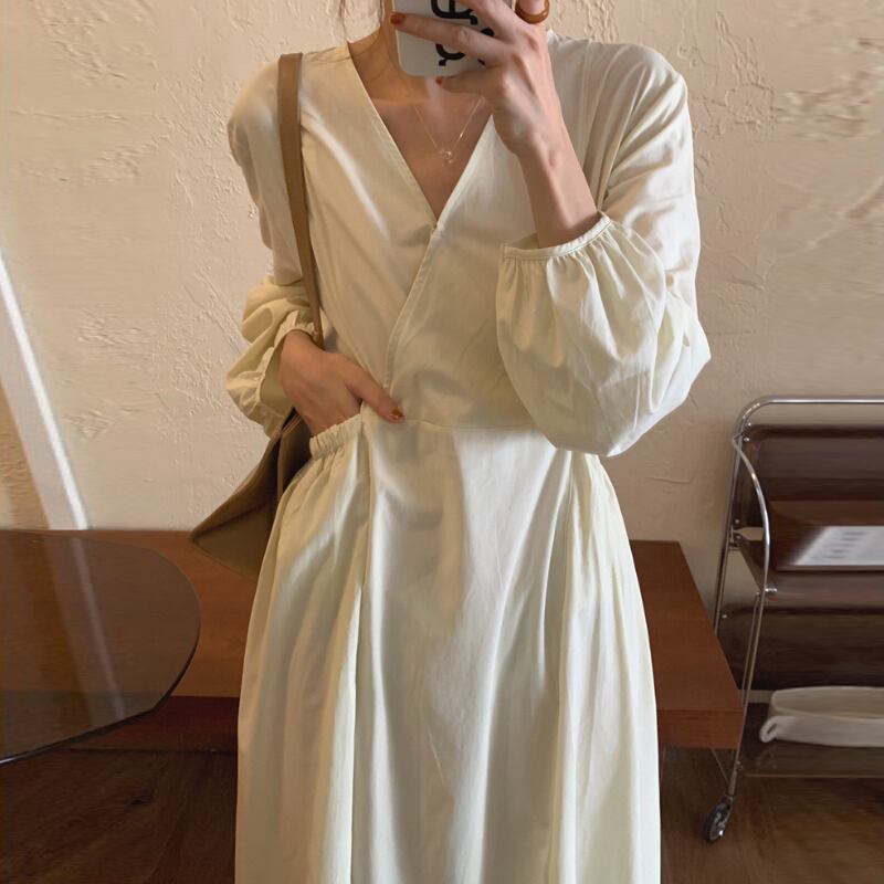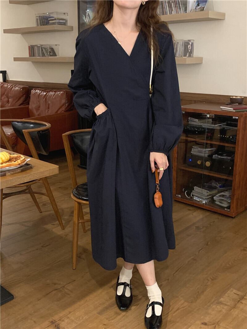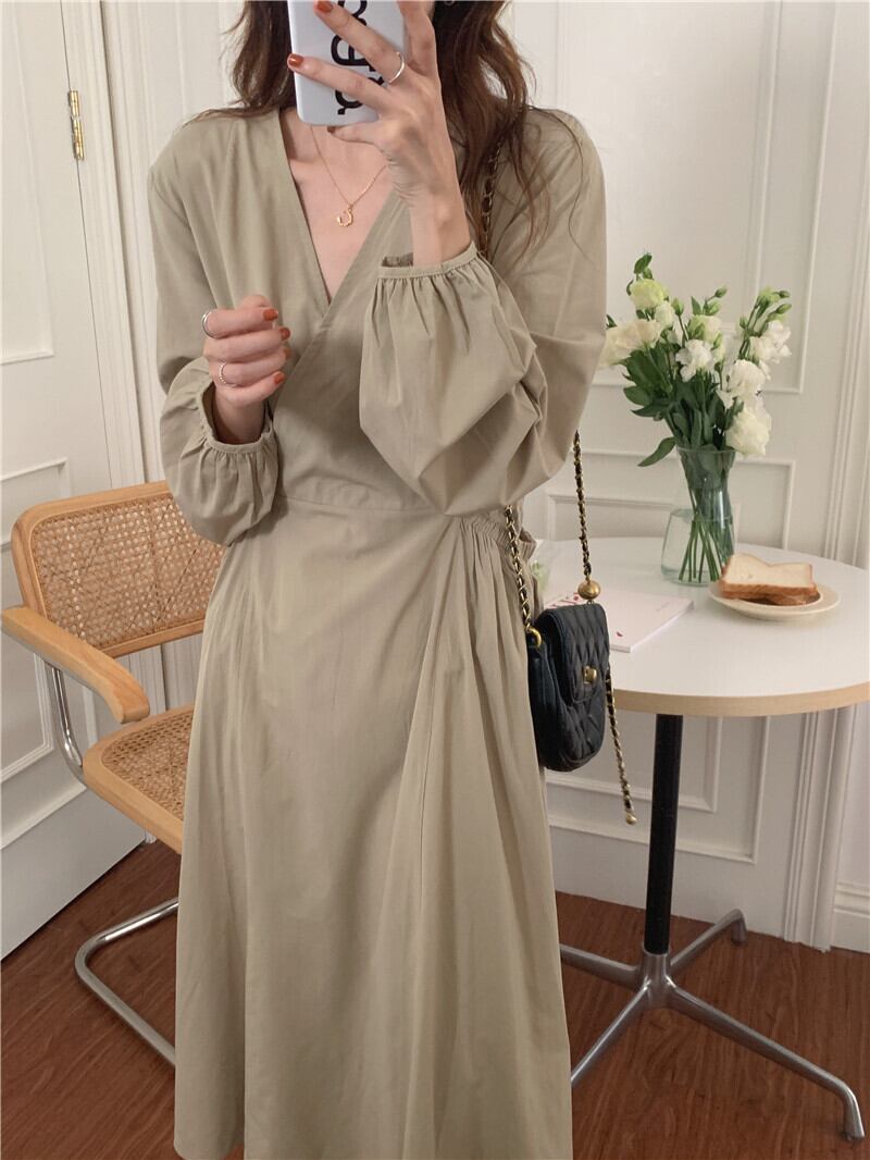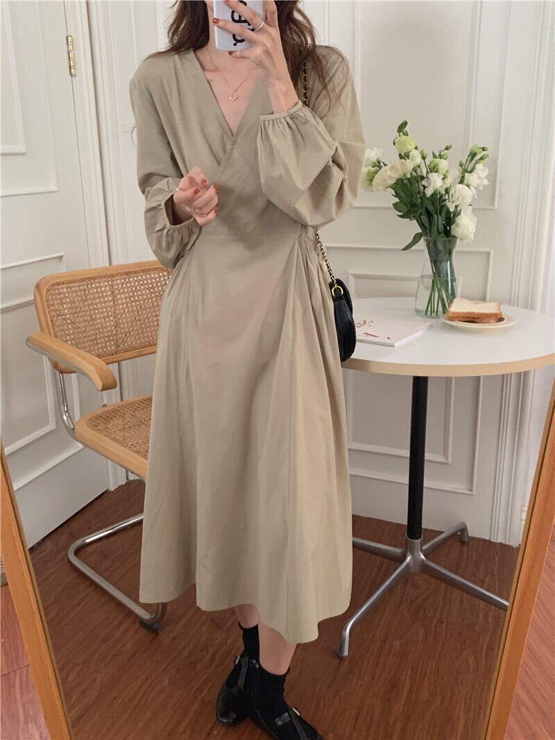 Ⅴネックワンピース ワンピース フレアワンピース ミモレ ミモレ丈 ロング ロング丈 袖あり 長袖 Vネック カシュクール フレア ハイウエスト かわいい 大人可愛い きれいめ シンプル カジュアル 大人 上品 おしゃれ お洒落 かっこいい レトロ 大人可愛い 大人女子 こなれ感 キュート ガーリー エレガント モダン 主役級 存在感 無地 春 秋 10代 20代 30代 レディース 学生 通学 デート お出かけ 女子会 休日 着回し 普段使い 重ね着 韓国系 オルチャン ブラック ベージュ カーキ