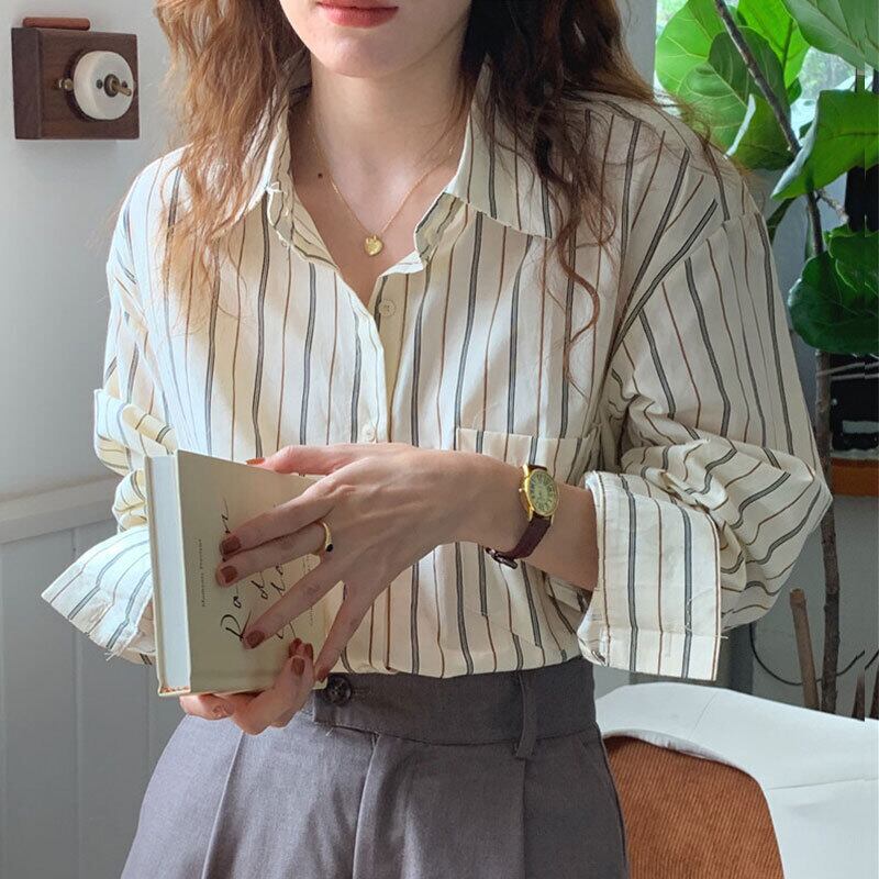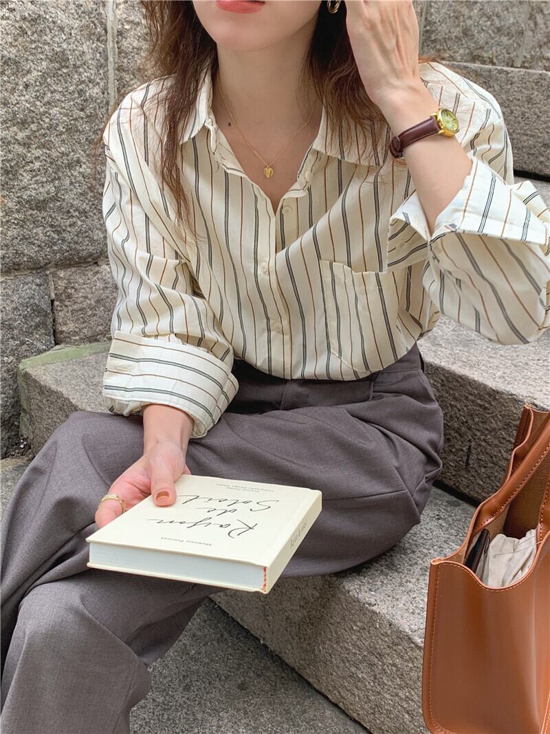 ストライプ柄シャツ トップス シャツ ブラウス 袖あり 長袖 襟付き 前開き かわいい 大人可愛い きれいめ シンプル カジュアル 大人 上品 おしゃれ お洒落 かっこいい レトロ 大人可愛い 大人女子 こなれ感 キュート ガーリー モダン 主役級 存在感 柄 ストライプ 春 秋 10代 20代 30代 レディース OL 通勤 学生 通学 デート お出かけ 女子会 休日 着回し 普段使い 重ね着 韓国系 オルチャン 色展開 ベージュ