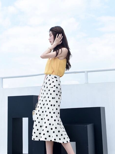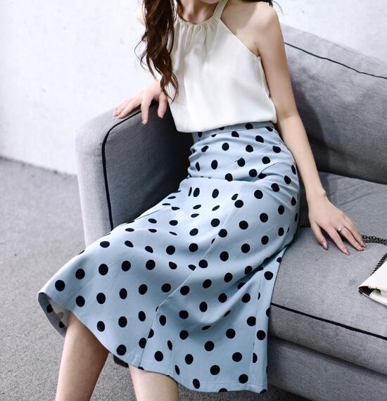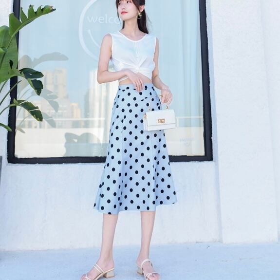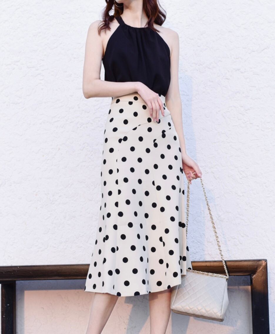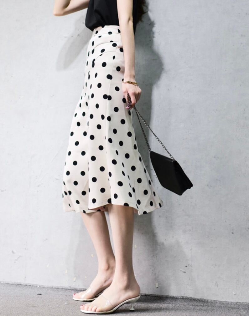 スカート ボトムス フィッシュテール ロング丈 フレア スリム ハイウエスト 大人可愛い きれいめ シンプル カジュアル おしゃれ レトロ 大人女子 こなれ感 ラブリー キュート ガーリー エレガント 存在感 ドット柄 水玉 春 夏 2021 20代 30代 40代 レディース デート お出かけ 女子会 休日 イベント 旅行 着回し 普段使い 韓国系 ファッション モテ 美脚 脚長 定番 インスタ映え サイズ XS S M L XL 色展開 ライトブルー 大人カラー アプリコット