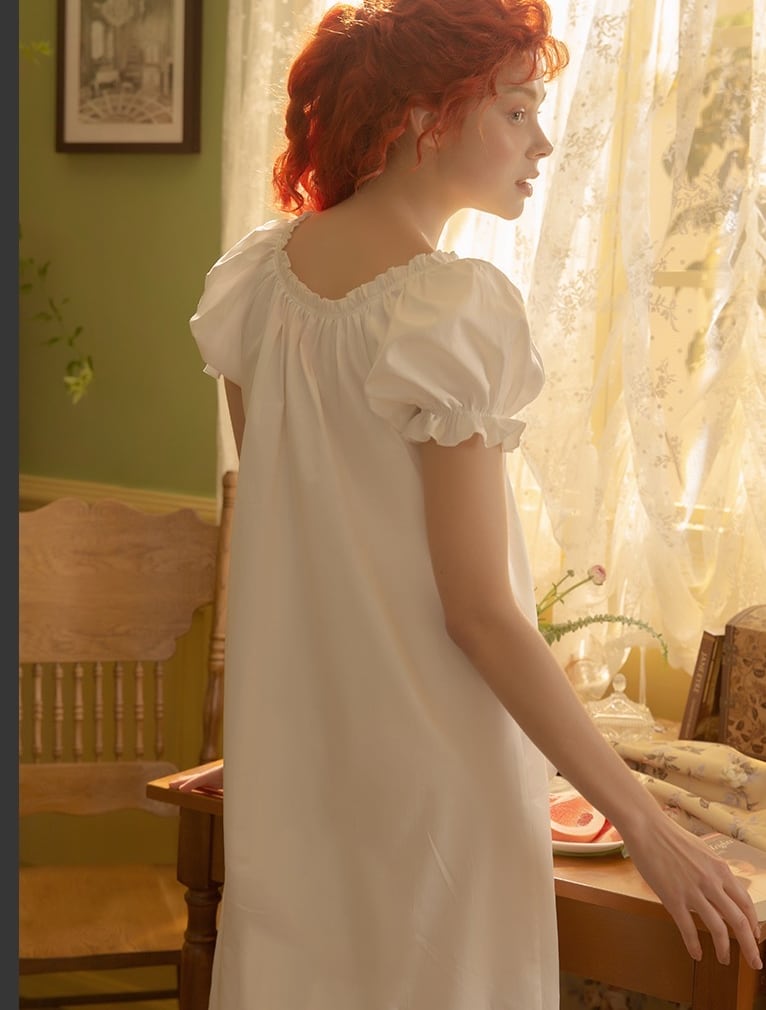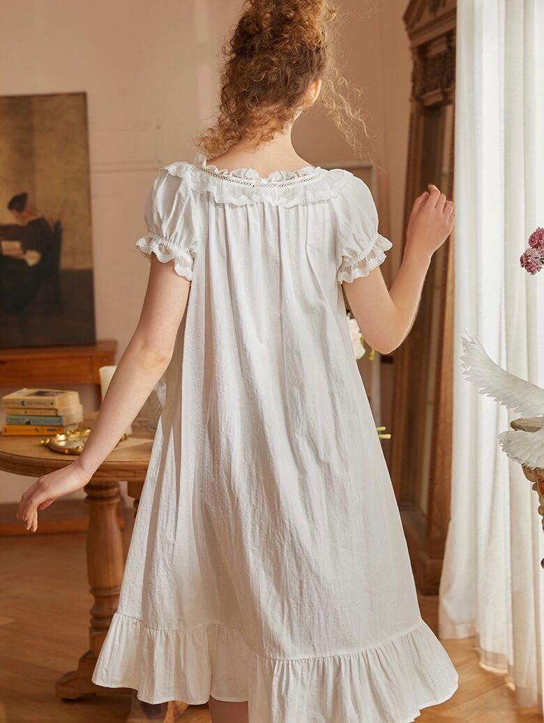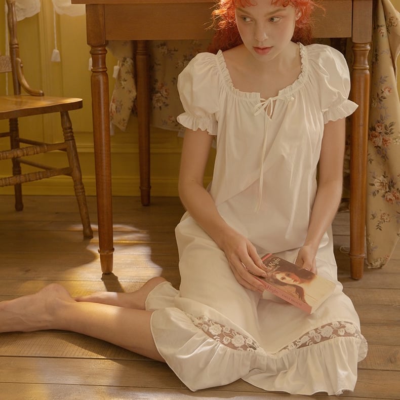 ワンピース ルームウェア パジャマ ひざ丈 膝下 袖あり 半袖 パフスリーブ ラウンドネック セミフレア Aライン レース フリル リボン 薄手 大人可愛い シンプル 上品 大人女子 ラブリー キュート ガーリー エレガント とろみ感 お嬢様 清楚感 無地 春 夏 10代 20代 30代 レディース 学生 お泊まり 休日 旅行 モテ 体系カバー 美脚 インスタ映え ヨーロピアン サイズ S M L 色展開 ホワイト ピンク