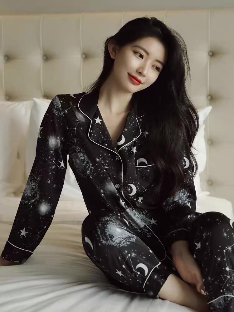 個性的なデザインがおしゃれな、ギャラクシー柄。選べる袖丈で、春から秋まで着まわせます。旅行先に持っていくのも◎ホームパジャマとしてもおすすめです。とろみ感があって、ブラックカラーでも女性らしく柔らかさがありますよ。