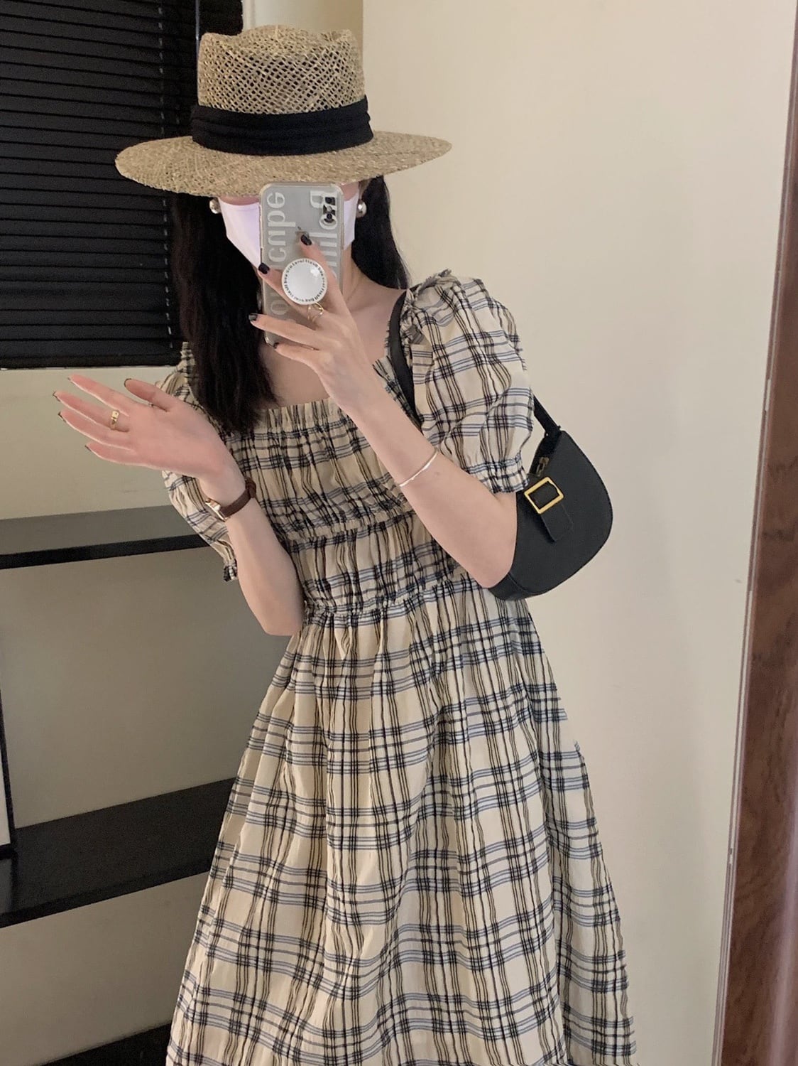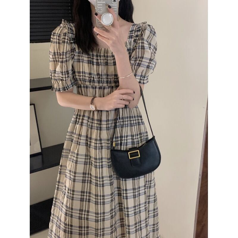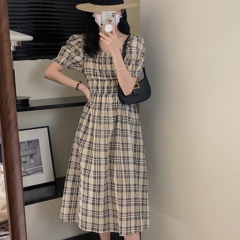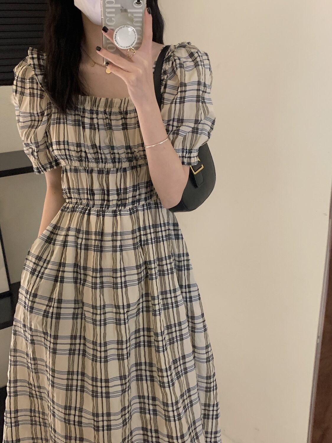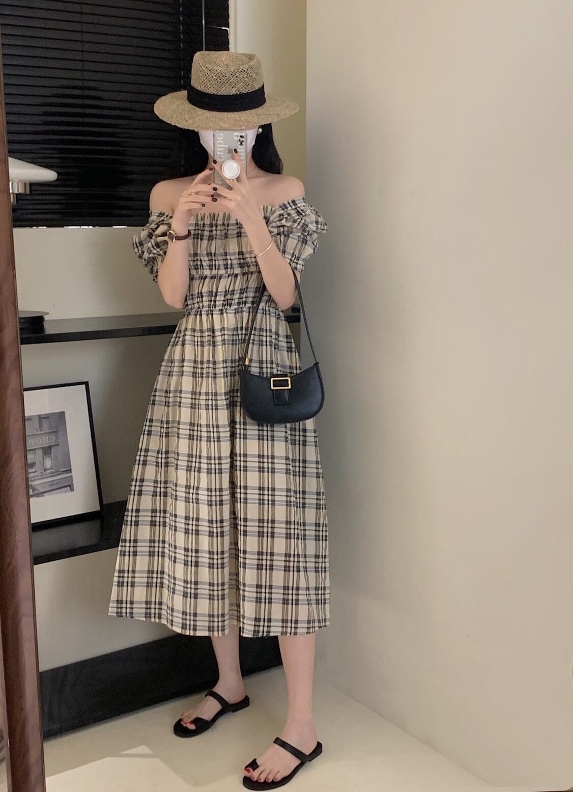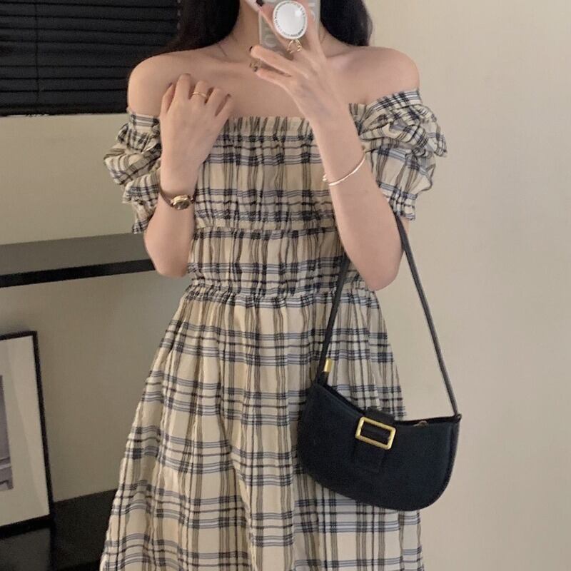 韓国 正方形 カラークラシックチェックバブルスリーブドレスレディース夏 ウエストロングスカート ワンピース フレアワンピース 膝下 ロング 半袖 スクエアネック オフショルダー Aライン シフォン ウエストマーク ハイウエスト 大人可愛い シンプル カジュアル 大人 おしゃれ レトロ 大人女子 ラフ キュート チェック柄 春 夏 10代 20代 30代 レディース OL 通勤 学生 通学 デート お出かけ 女子会 お泊まり 休日 旅行 着回し 普段使い 重ね着 ベージュ
