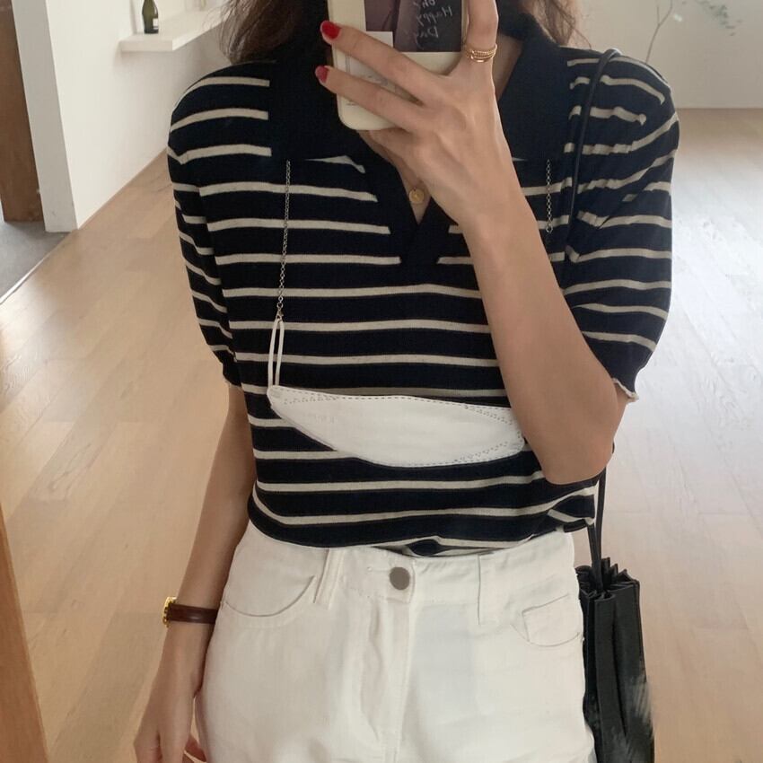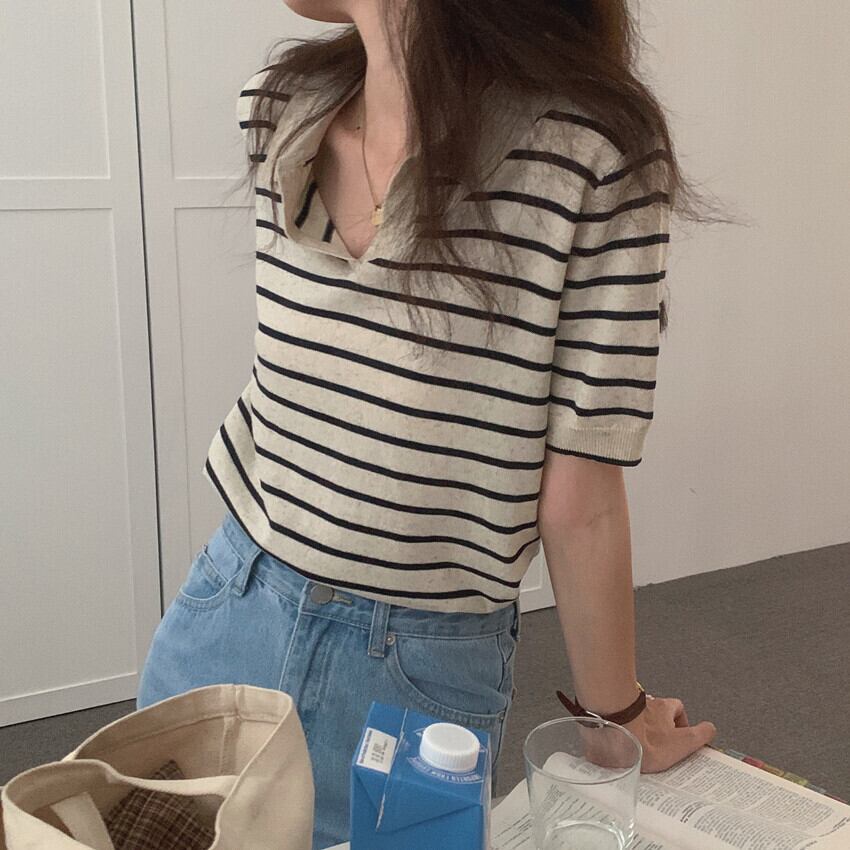 韓国 シック 夏 ミニマリスト ヴィンテージ ラペルルーストライプ ニット トップ カジュアル 半袖 Tシャツ 女性 トップス Tシャツ ミディアム丈 半袖 Vネック ストレート 大人可愛い きれいめ シンプル カジュアル おしゃれ レトロ アジアン 大人可愛い 大人女子 ラフ キュート ガーリー ボーダー 春 夏 10代 20代 30代 40代 50代 レディース OL 通勤 学生 通学 デート お出かけ 女子会 お泊まり 休日 旅行 着回し 普段使い ブラック アプリコット