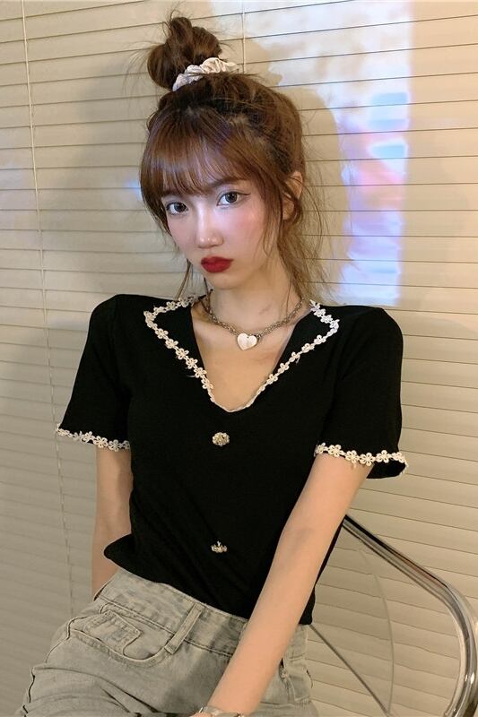 半袖ニット トップス ニットソー セーター 袖あり 半袖 Vネック 襟付き レース かわいい 大人可愛い きれいめ シンプル カジュアル 大人 上品 おしゃれ お洒落 かっこいい レトロ 大人可愛い 大人女子 こなれ感 キュート ガーリー クール 主役級 存在感 無地 春 夏 10代 20代 30代 レディース OL 通勤 学生 通学 デート お出かけ 公園デビュー 女子会 休日 着回し 普段使い 重ね着 韓国系 オルチャン サイズ XL 2XL 3XL 4XL 色展開 黒 ブラック