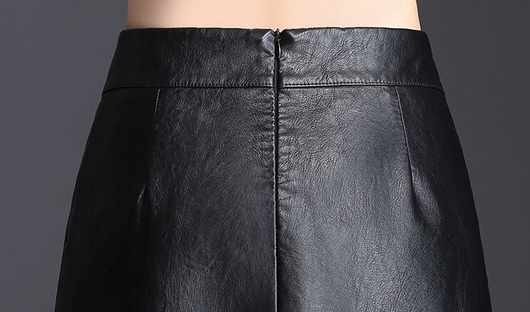 シンプルなデザインのフェイクレザースカート。
