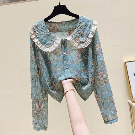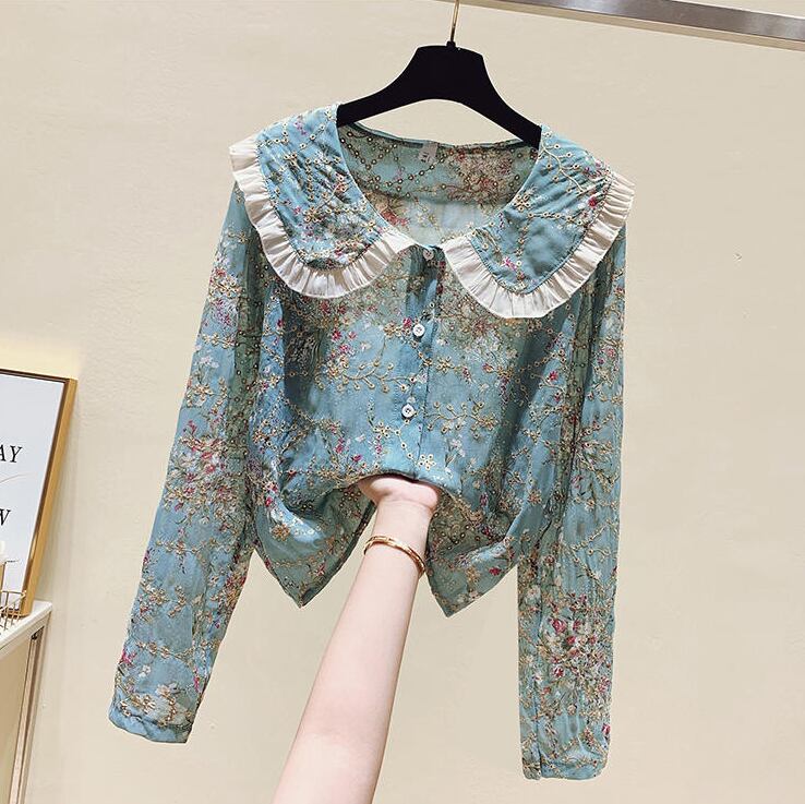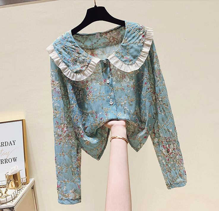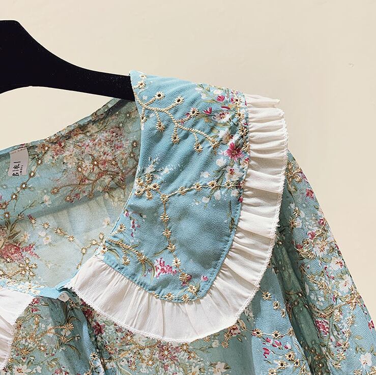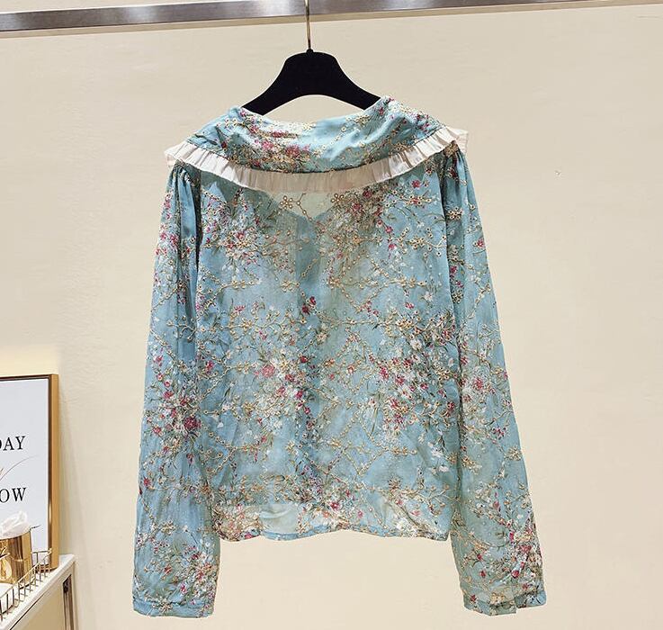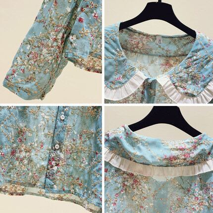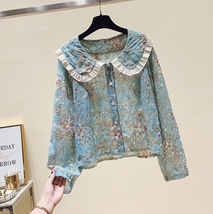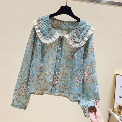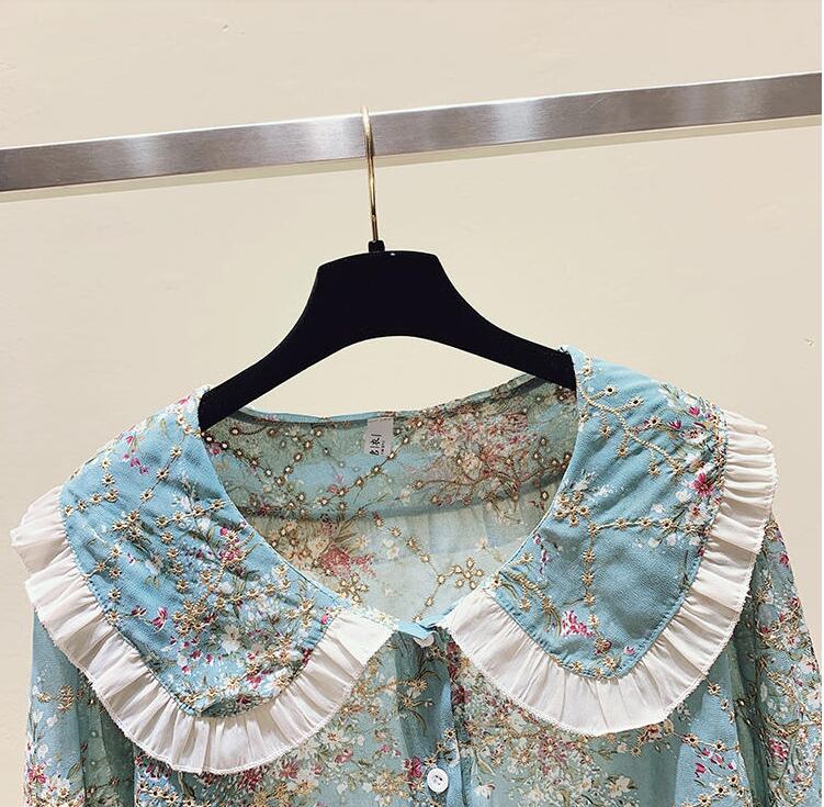 花柄ブラウス トップス シャツ ブラウス 袖あり 長袖 ラウンドネック 襟付き フリル 前開き かわいい 大人可愛い きれいめ シンプル カジュアル 大人 上品 おしゃれ お洒落 かっこいい レトロ 大人可愛い 大人女子 こなれ感 キュート ガーリー クール 主役級 存在感 柄 花柄 春 秋 10代 20代 30代 レディース OL 通勤 学生 通学 デート お出かけ 公園デビュー 女子会 休日 着回し 普段使い 重ね着 韓国系 オルチャン サイズ S M L XL 2XL 色展開 ブルー