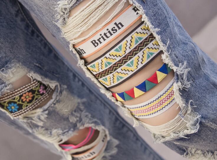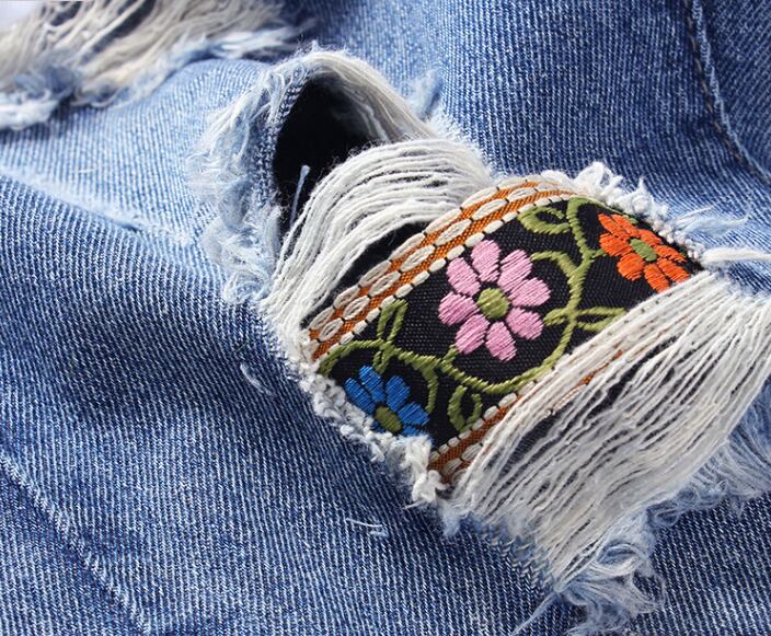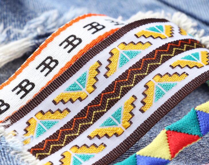 ダメージクラッシュ加工にチロリアンテープで配色を施したおしゃれなデニムパンツ。