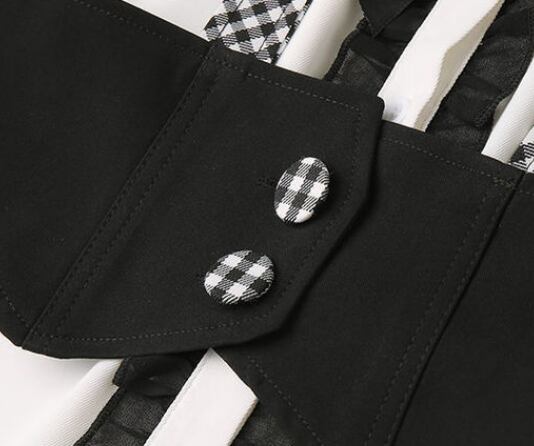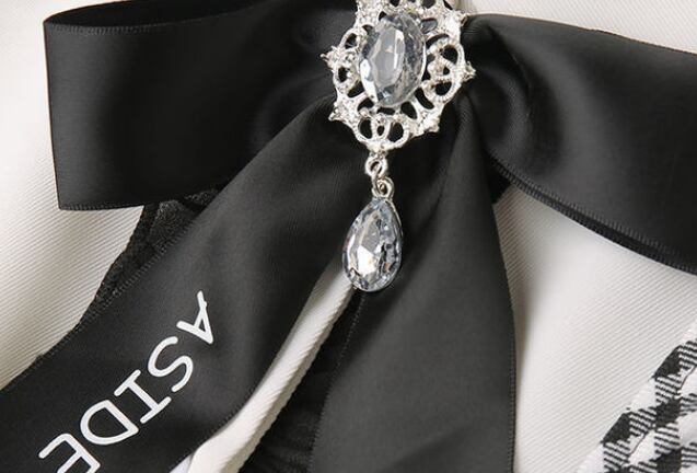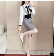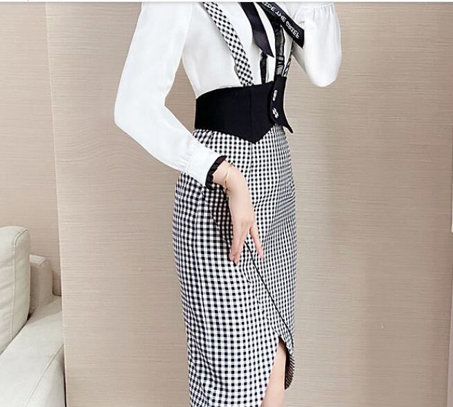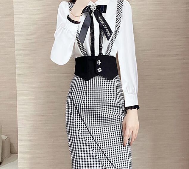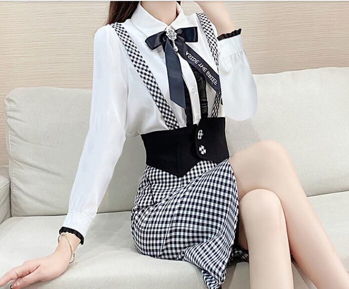 長袖ブラウスとチェックタイトスカートのセットアップです。