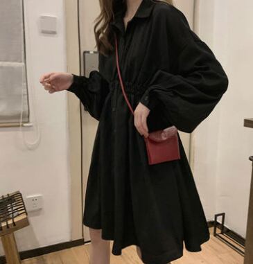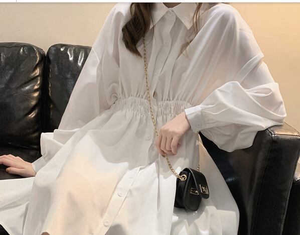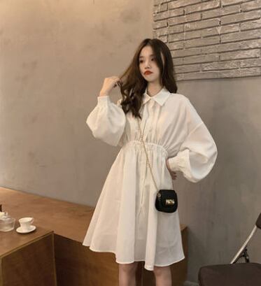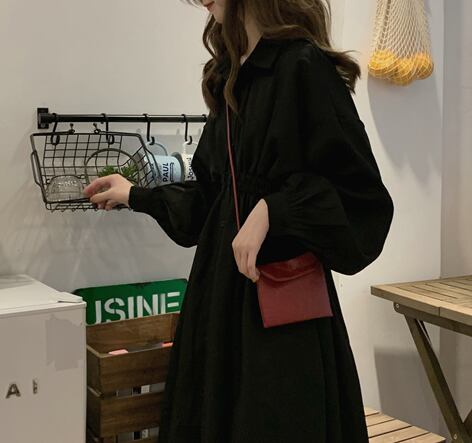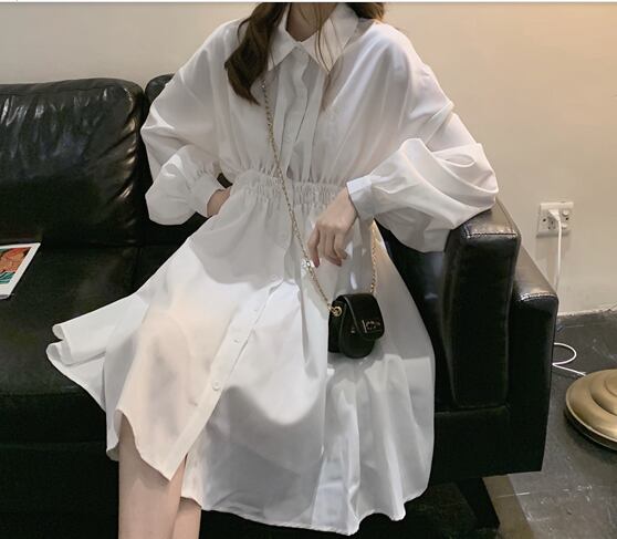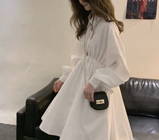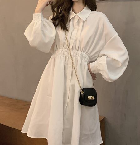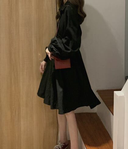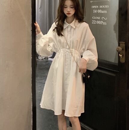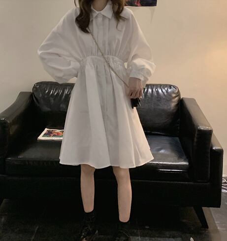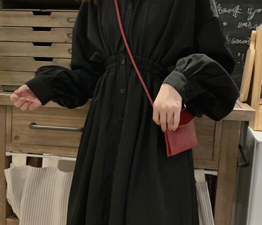 無地でシンプルな長袖シャツ膝丈ワンピースです。