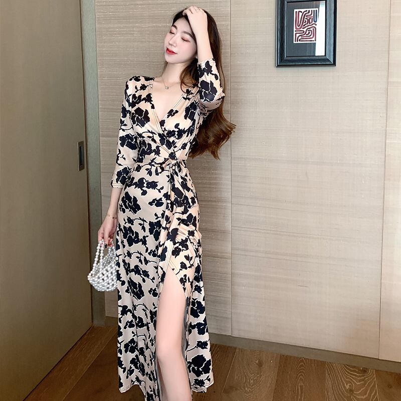 ワンピース ロング丈 袖あり 7分袖 Vネック ストレート Iライン スリット ハイウエスト きれいめ 大人 おしゃれ かっこいい 大人女子 クール モード系 セクシー エレガント 存在感 ボタニカル 春 秋 2022 20代 30代 40代 レディース デート お出かけ 女子会 休日 パーティー イベント ホテル レストラン 着回し オルチャン 美脚 脚長 新作 インスタ映え サイズ S M L XL 2XL 色展開 ホワイト