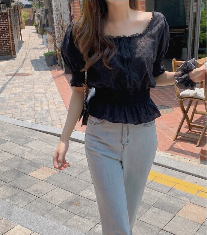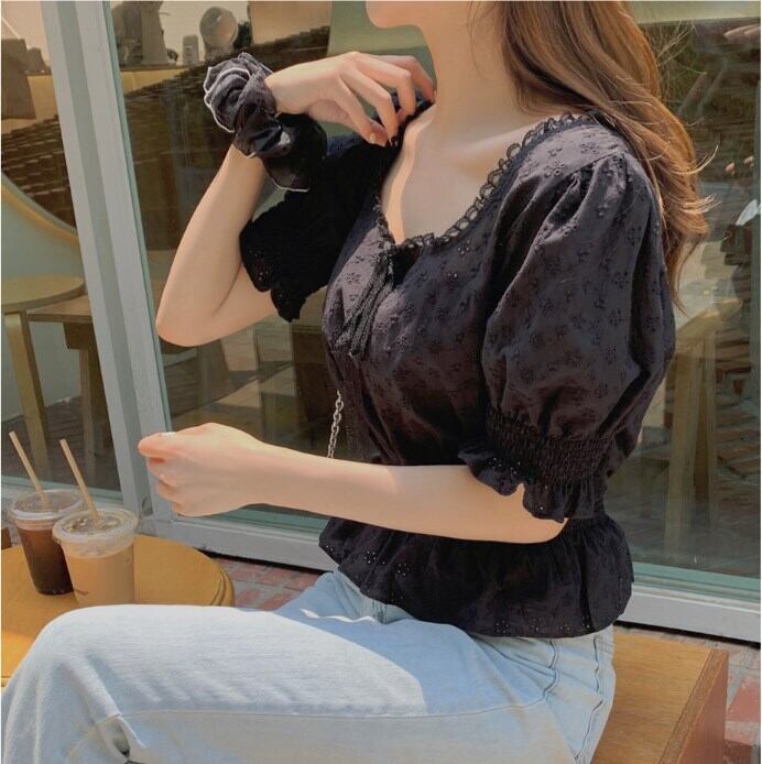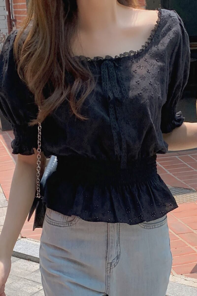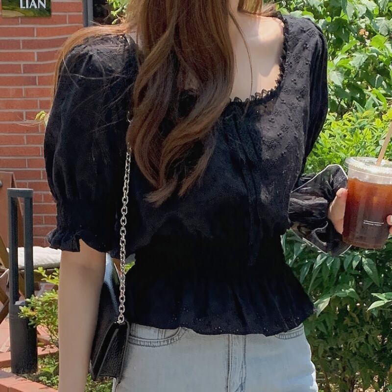 韓国 夏 ラウンドカラー プリーツデザイン シングル ファッションバブルスリーブ シャツ トップス 女性 トップス シャツ ショート ショート丈 半袖 スクエアネック ストレート 刺繍 大人可愛い きれいめ シンプル カジュアル 大人 おしゃれ レトロ 大人女子 こなれ感 ラフ キュート ガーリー クール 柄 春 夏 10代 20代 30代 レディース OL 通勤 学生 通学 デート お出かけ お泊まり 休日 旅行 着回し 普段使い ブラック