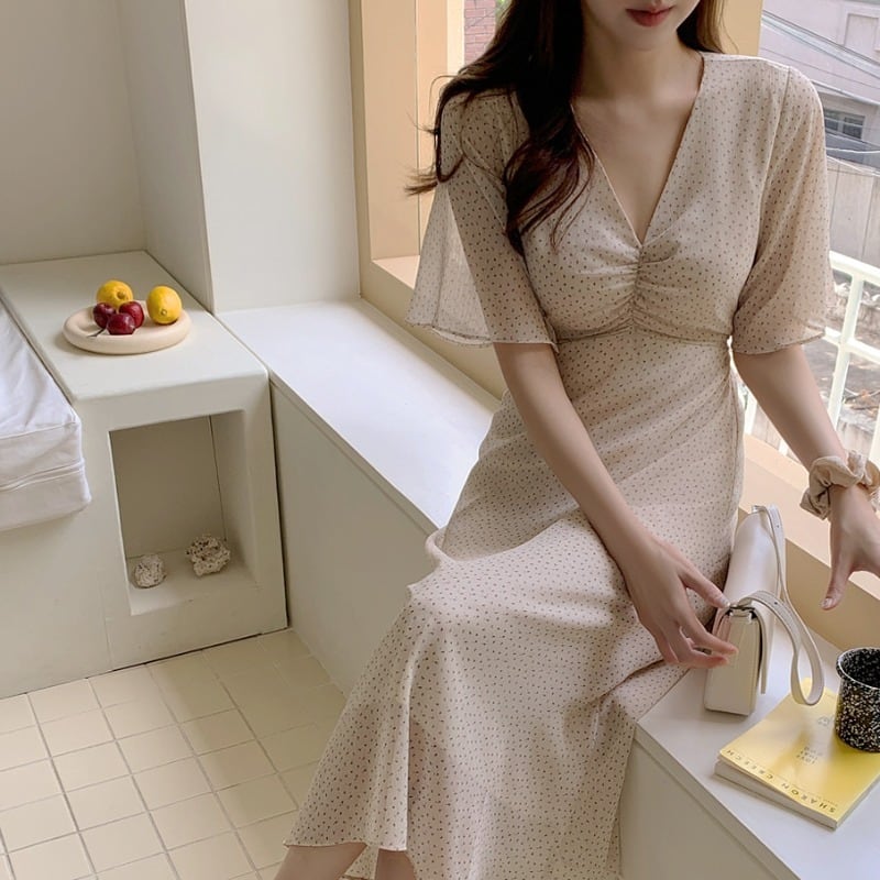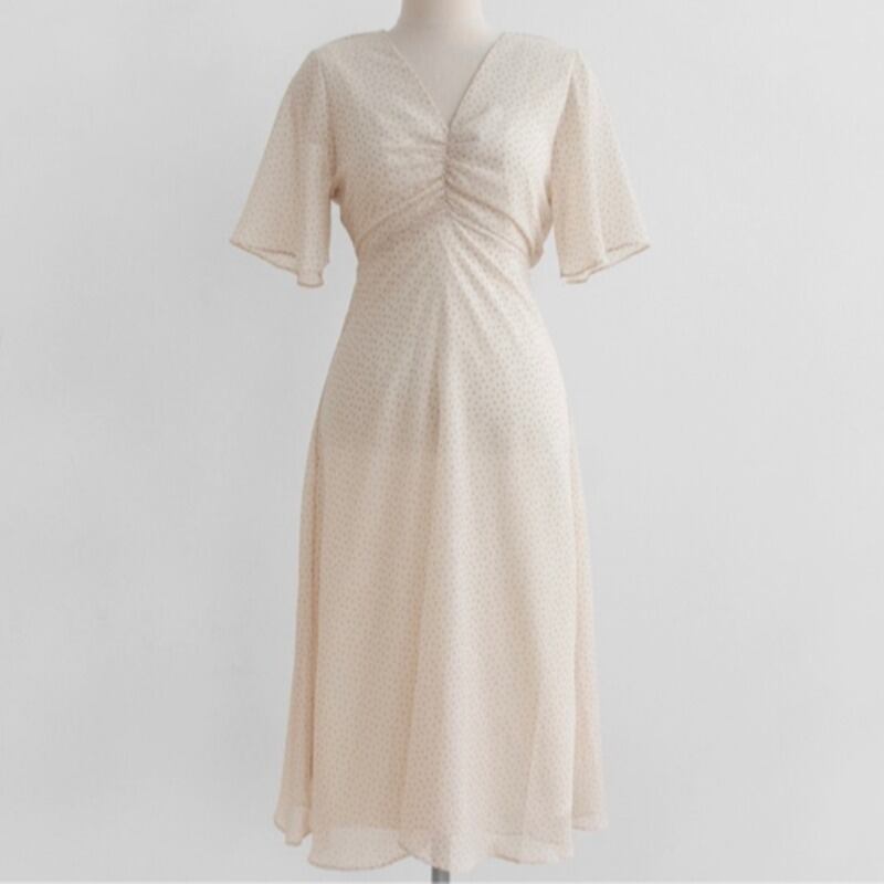 韓国 夏 スキニー Vネック 小さな花 長い シフォンドレス 女性 ワンピース フレアワンピース ミモレ丈 ロング 半袖 Vネック Aライン シフォン ウエストマーク ハイウエスト 大人可愛い きれいめ シンプル カジュアル 大人 おしゃれ 大人女子 ラフ ラブリー キュート 柄 夏 10代 20代 30代 レディース OL 通勤 学生 通学 デート お出かけ 女子会 お泊まり 休日 リゾート 旅行 普段使い S M L XL アプリコット