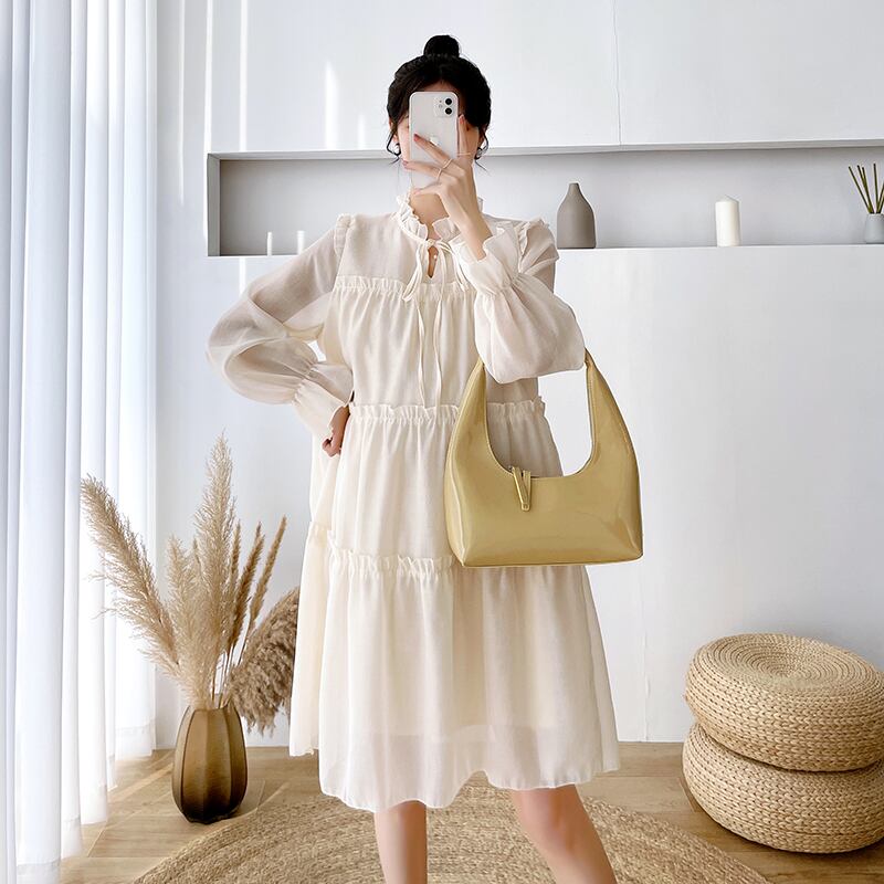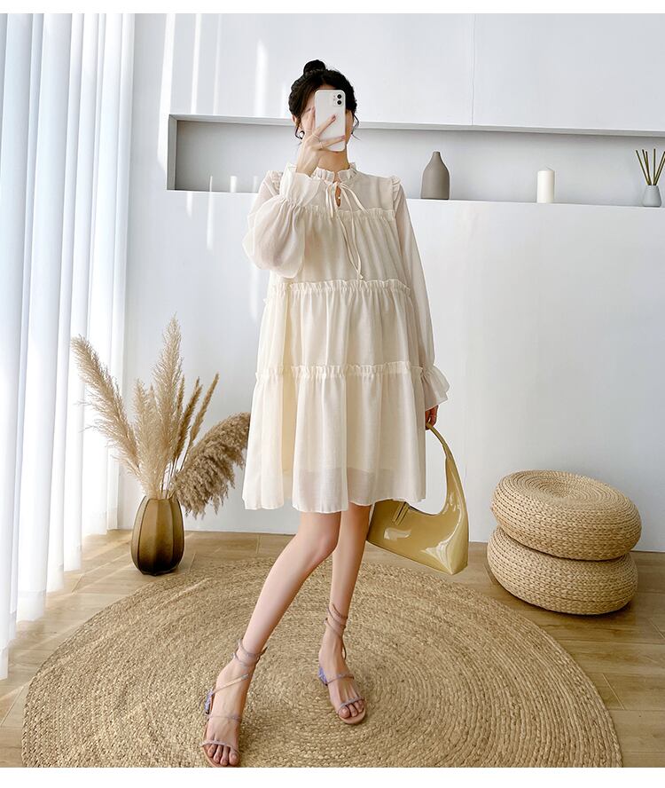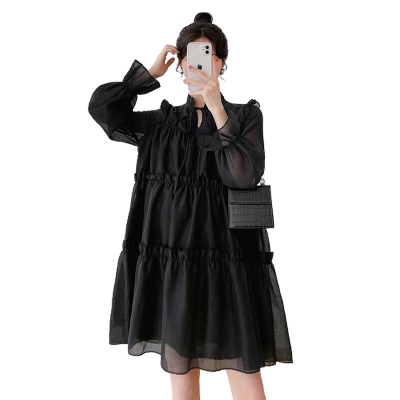 マタニティ ドレス 秋服 ファッション ウッドイヤーサイド 長袖 メッシュ ドレス ルーズ ビッグサイズ スカート 秋 ワンピース フレアワンピース 膝下 長袖 ハイネック ワイド シフォン フリル リボン 透け感 大人可愛い きれいめ シンプル カジュアル 大人 おしゃれ 大人可愛い 大人女子 ラフ キュート 無地 秋 10代 20代 30代 ママ マタニティ OL 通勤 学生 通学 デート お出かけ お泊まり 休日 旅行 着回し 普段使い 楽ちん M L XL 2XL ブラック アプリコット