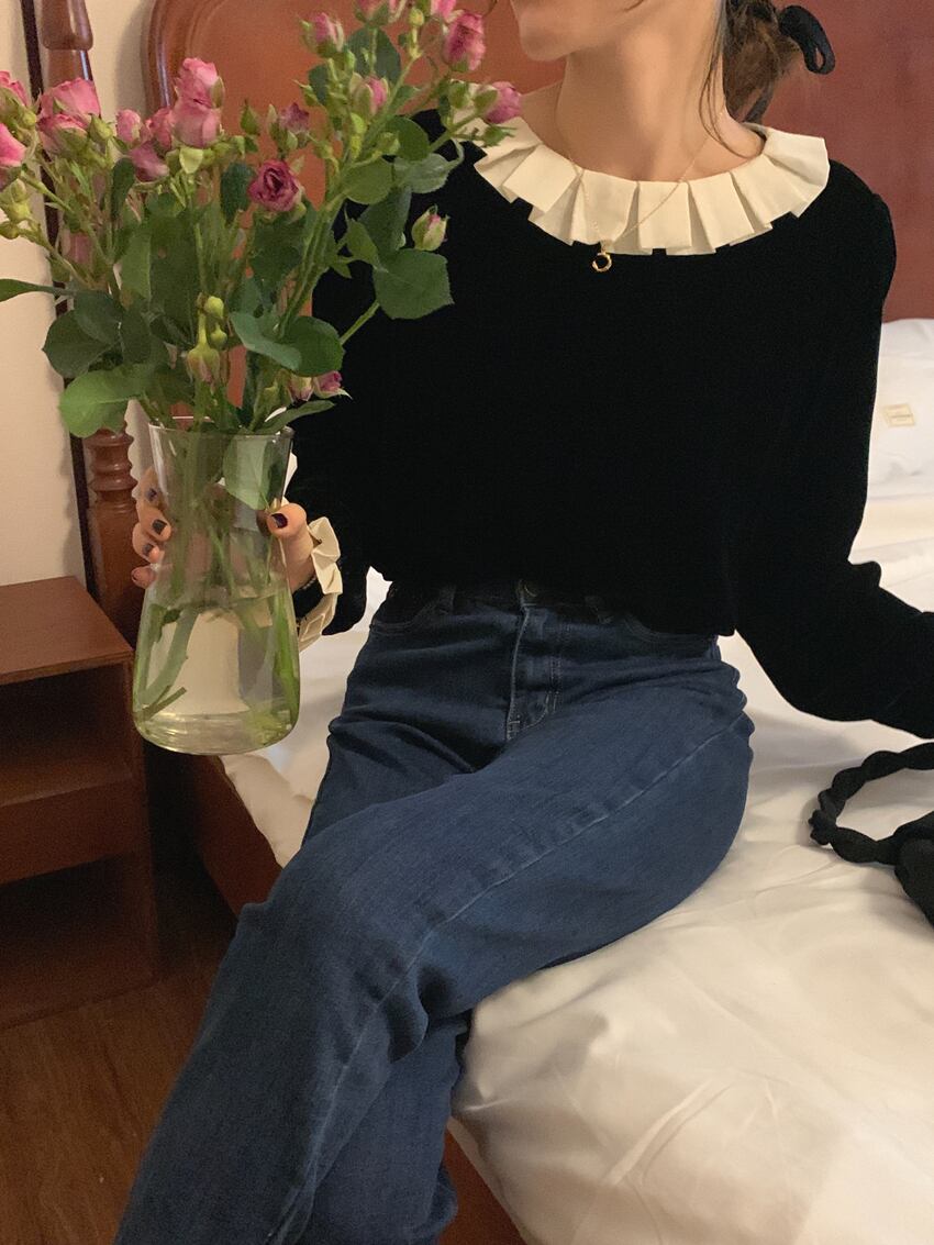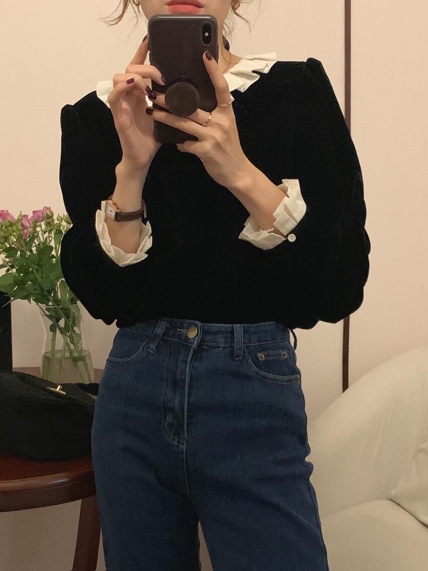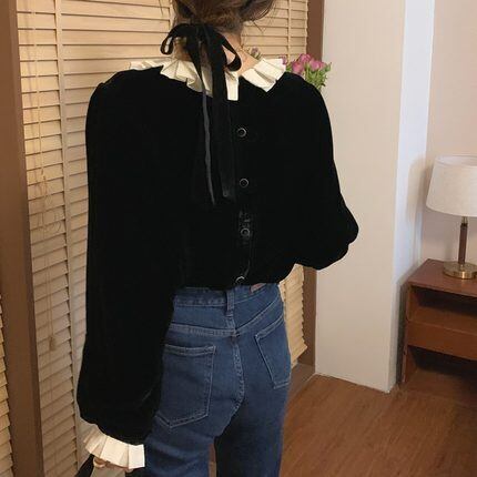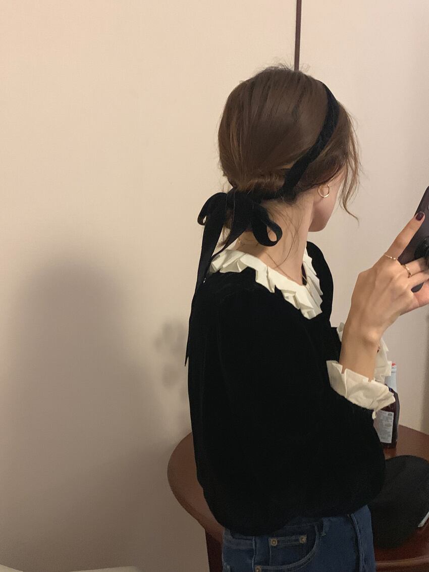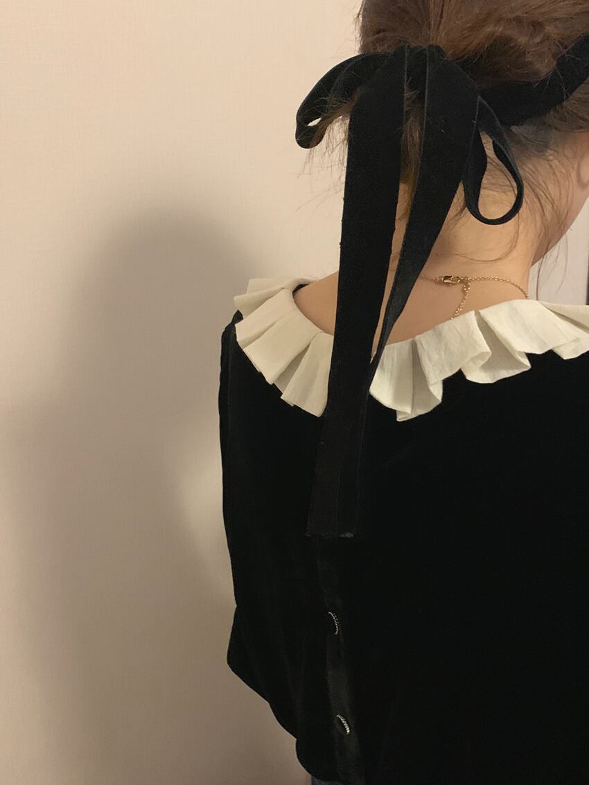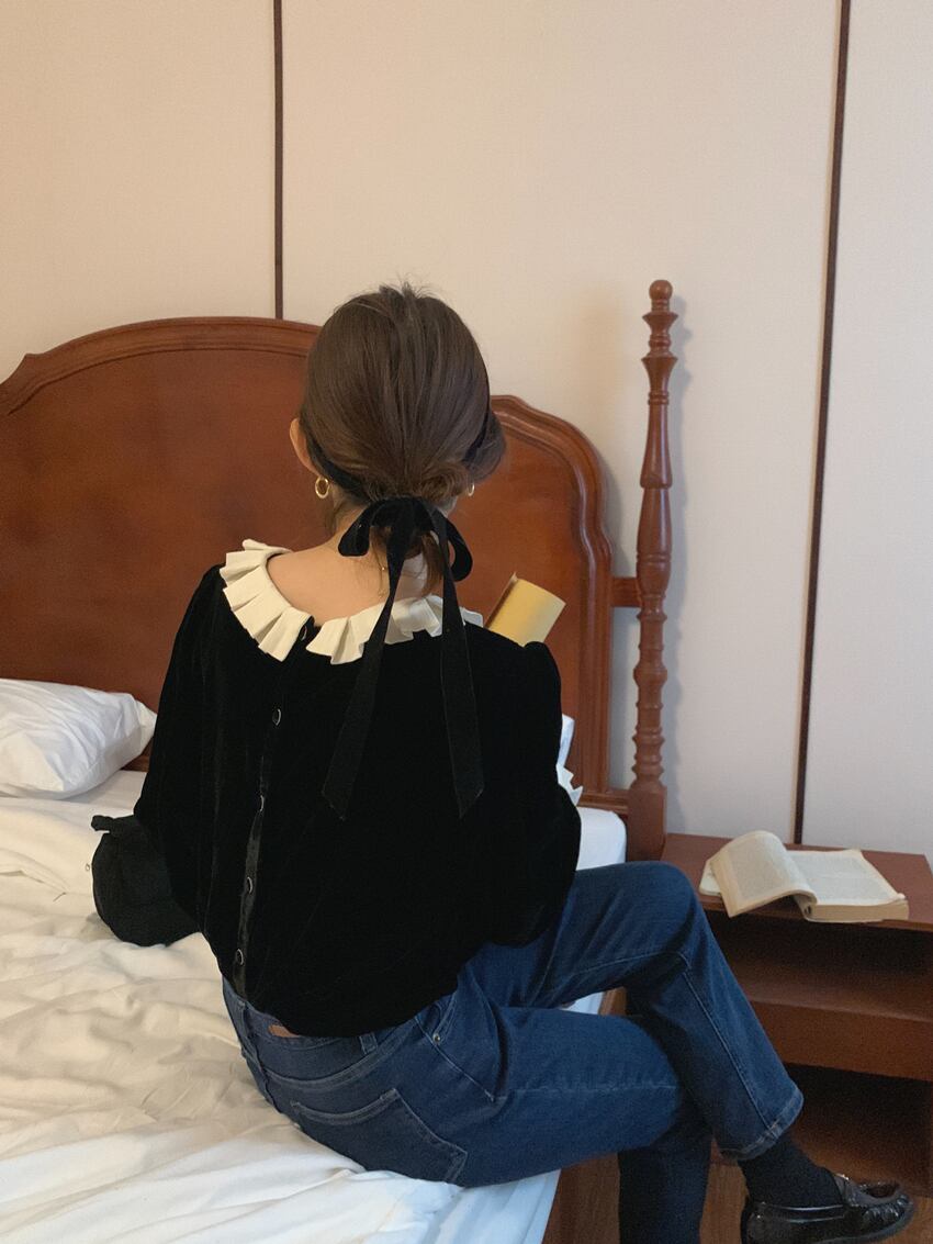 フリルの襟と袖がガーリーなベルベットブラウス。