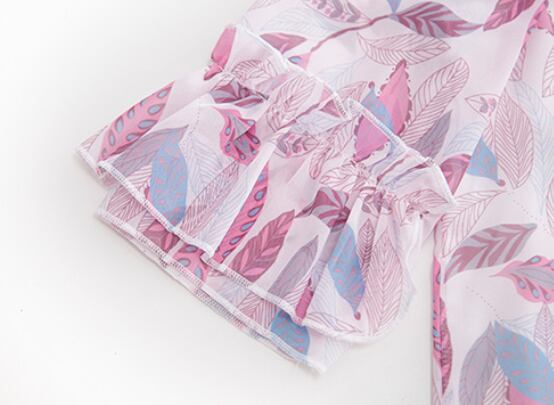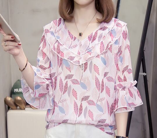 トップス ブラウス ミディアム丈 袖あり 5分袖 フレアスリーブ Vネック フレア ストレート シフォン 透け感 薄手 大人可愛い カジュアル おしゃれ 大人女子 ラブリー キュート ガーリー エレガント 存在感 柄 リーフ柄 春 夏 10代 20代 30代 レディース デート お出かけ 女子会 休日 イベント リゾート 海 プール 着回し 普段使い オルチャン モテ 体系カバー インスタ映え サイズ L XL 2XL 3XL 色展開 ピンク