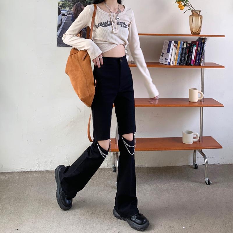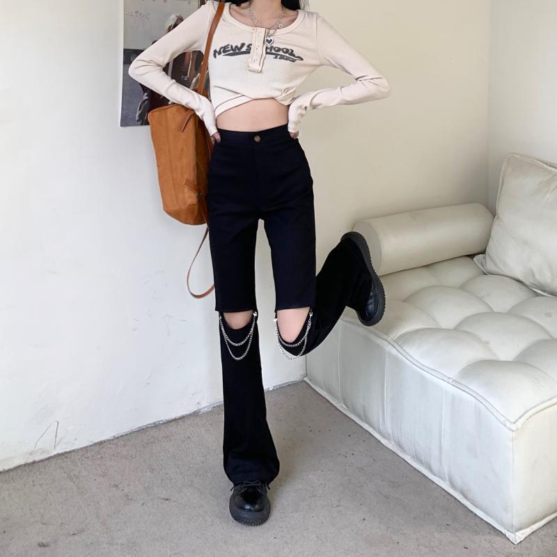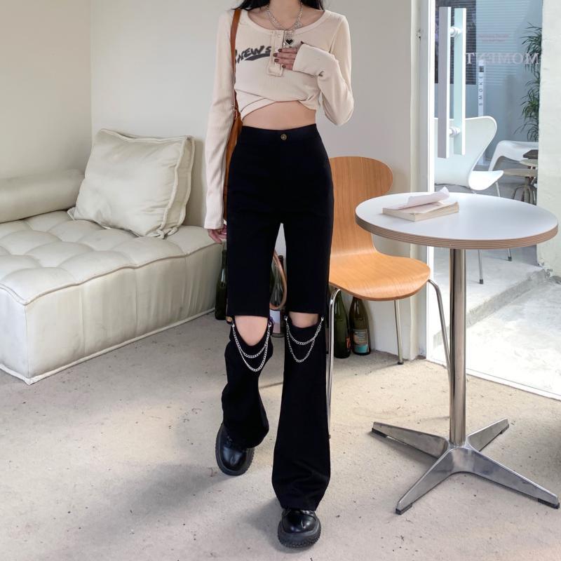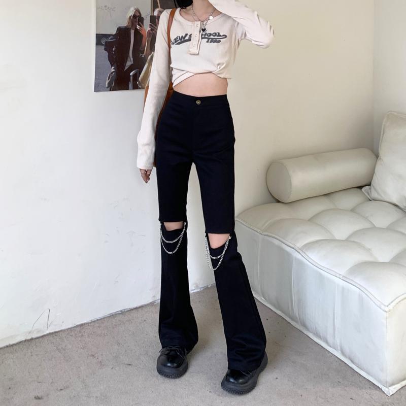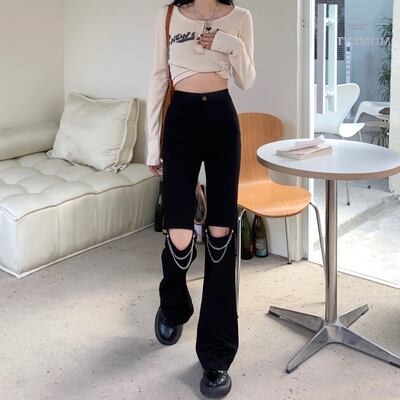 チェーン付デニムフレアパンツ ボトムス パンツ デニムパンツ ロング ロング丈 フレア ハイウエスト デニム かわいい 大人可愛い きれいめ シンプル カジュアル 大人 上品 おしゃれ お洒落 大人可愛い 大人女子 こなれ感 個性的 クール 主役級 存在感 無地 春 夏 秋 10代 20代 30代 レディース 学生 通学 デート お出かけ 公園デビュー 休日 着回し 普段使い 韓国系 オルチャン サイズ S M L 色展開 黒 ブラック