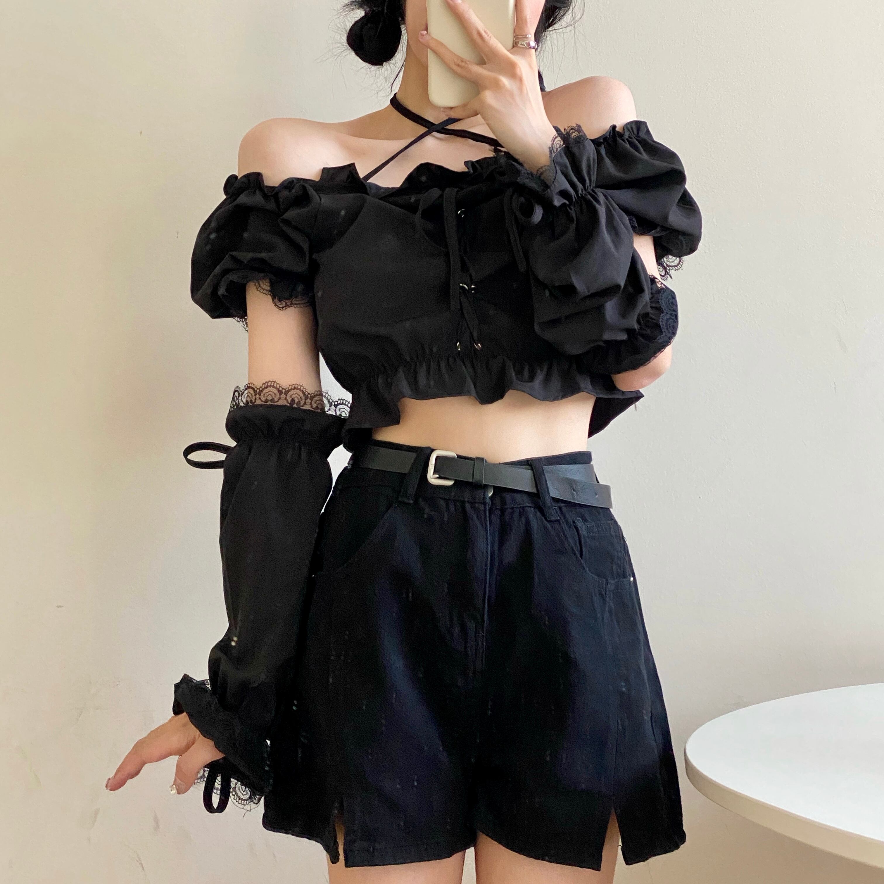 ショート丈トップスと同素材アームウォーマーのセット。
