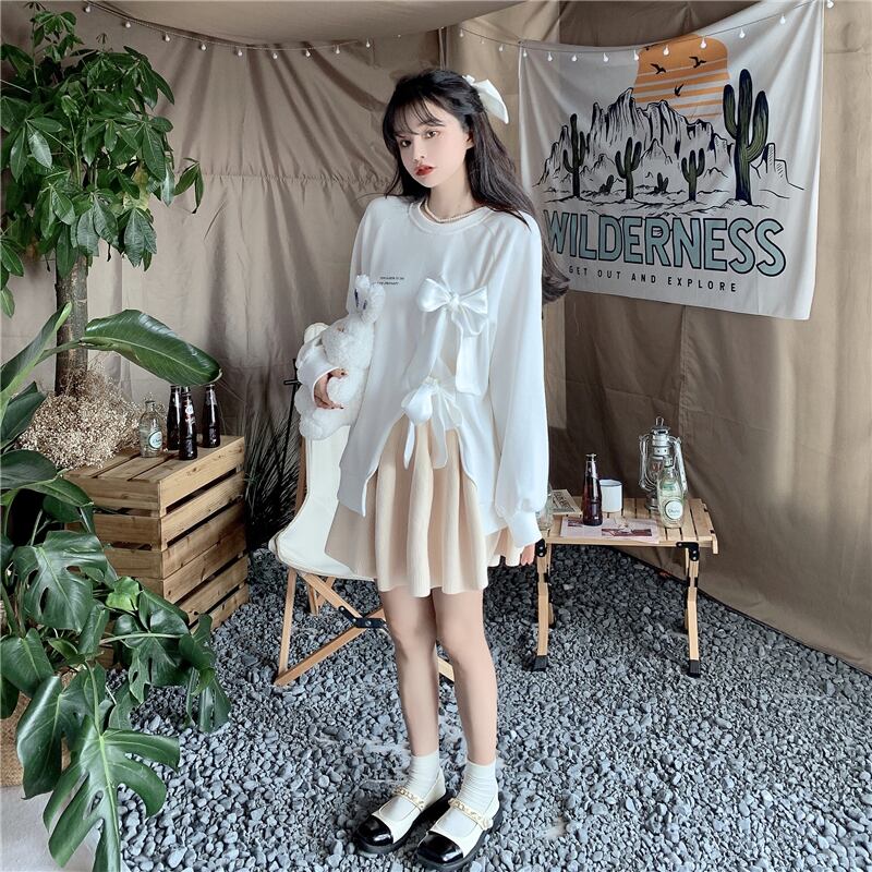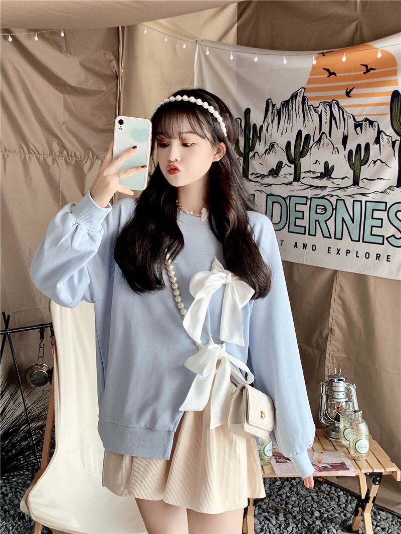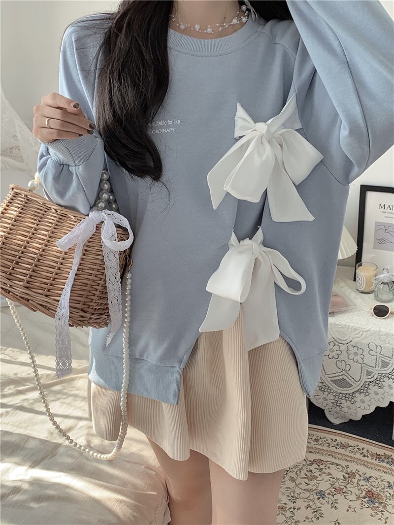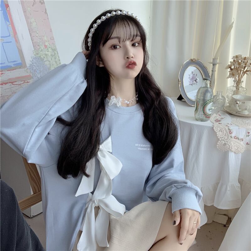 リボンスウェット トップス プルオーバー トレーナー 袖あり 長袖 ラウンドネック リボン スリット かわいい 大人可愛い きれいめ シンプル カジュアル 大人 上品 おしゃれ お洒落 大人可愛い 大人女子 こなれ感 個性的 クール 主役級 存在感 無地 春 秋 冬 10代 20代 30代 レディース 学生 通学 デート お出かけ 公園デビュー 休日 着回し 普段使い 重ね着 韓国系 オルチャン 色展開 白 ホワイト 青 ブルー