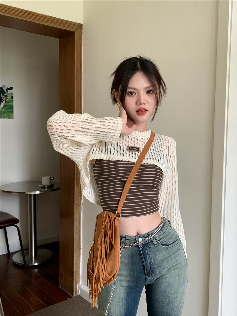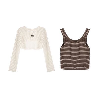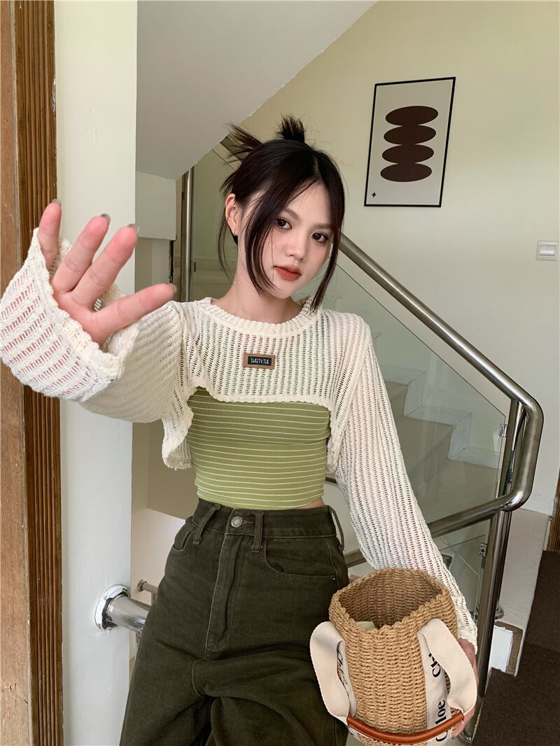 長袖ニット タンクトップ トップス ニットソー セーター ショート ショート丈 袖あり 長袖 ラウンドネック 2点セット ツーピース かわいい 大人可愛い きれいめ シンプル カジュアル 大人 上品 おしゃれ お洒落 大人可愛い 大人女子 こなれ感 個性的 クール 主役級 存在感 無地 柄 ボーダー 春 夏 秋 10代 20代 30代 レディース 学生 通学 デート お出かけ 公園デビュー 女子会 休日 着回し 普段使い 重ね着 韓国系 オルチャン 色展開 緑 グリーン 茶色 ブラウン