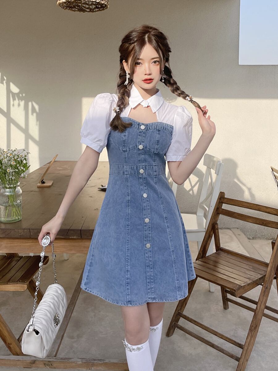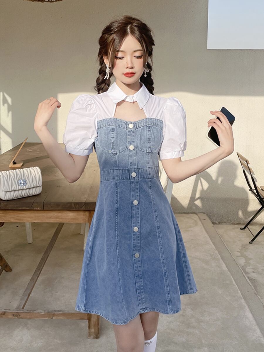 ドッキングワンピース ワンピース フレアワンピース ワンピドレス ミニ ミニ丈 袖あり 半袖 パフスリーブ 襟付き フレア Aライン ドッキング ドッキング デニム かわいい 大人可愛い きれいめ シンプル カジュアル 大人 上品 おしゃれ お洒落 大人可愛い 大人女子 こなれ感 個性的 クール 主役級 存在感 無地 ボーダー 春 夏 秋 10代 20代 30代 レディース 学生 通学 デート お出かけ 公園デビュー 女子会 休日 着回し 普段使い 重ね着 韓国系 オルチャン サイズ S M L XL