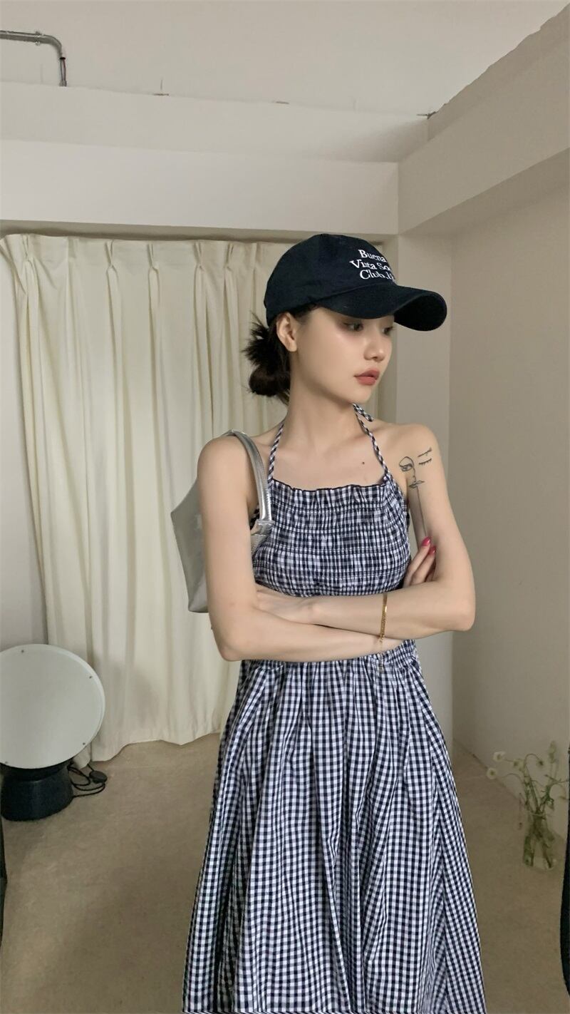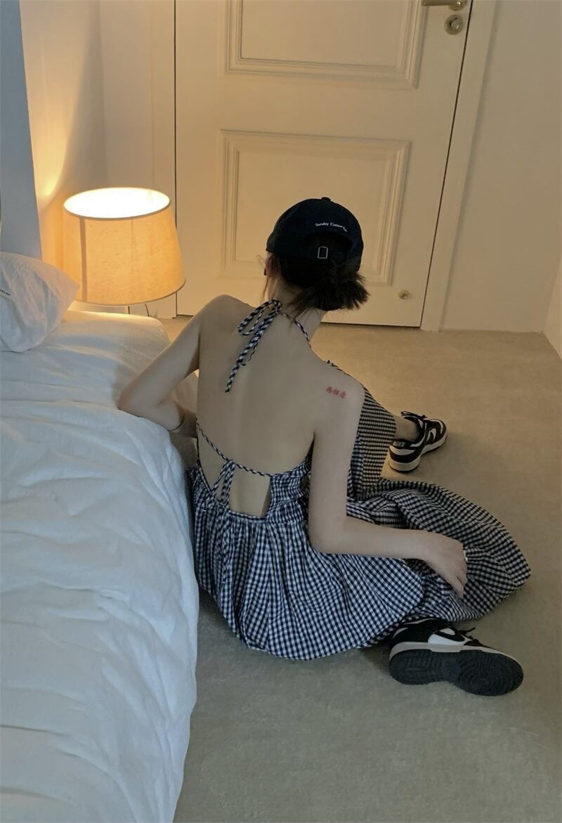 オープンバックの格子柄のワンピース