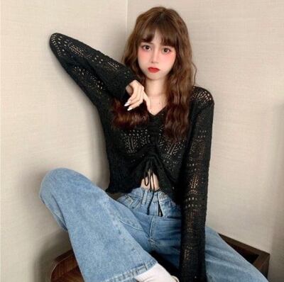 透かし編みニット トップス ニットソー セーター ショート ショート丈 袖あり 長袖 Vネック リボン クロシェ 透け感 かわいい 大人可愛い きれいめ シンプル カジュアル 大人 上品 おしゃれ お洒落 大人可愛い 大人女子 こなれ感 キュート ガーリー エレガント 主役級 存在感 無地 春 夏 秋 10代 20代 30代 レディース 学生 通学 デート お出かけ 公園デビュー 女子会 休日 着回し 普段使い 重ね着 韓国系 オルチャン 色展開 白 ホワイト 黒 ブラック カーキ