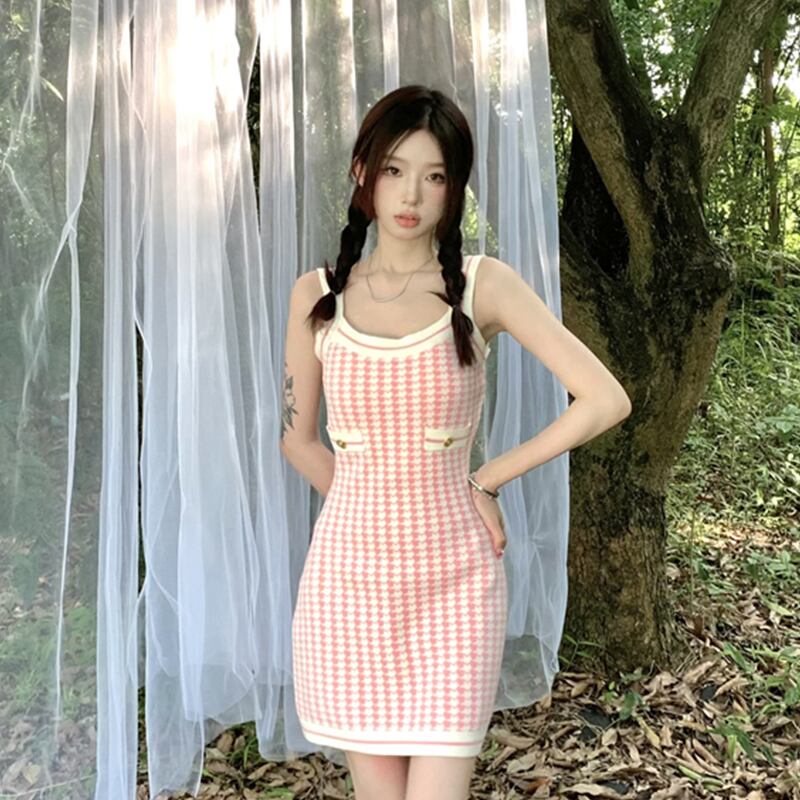 千鳥格子 ニットワンピース ミニ丈 袖なし ノースリーブ Aライン 伸縮性 かわいい レトロ 大人可愛い キュート 格子柄 春 夏 秋 10代 20代 レディース 女性用 デート お出かけ 休日 着回し 普段使い 重ね着 モテ フリーサイズ ピンク