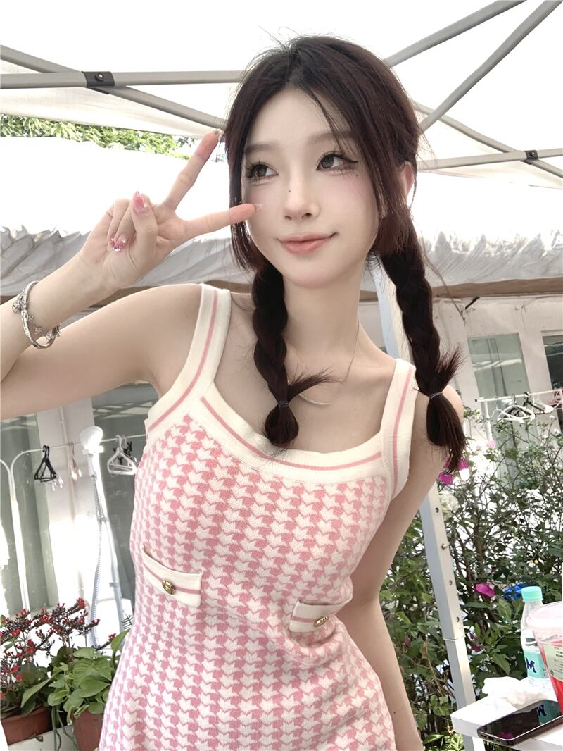 ピンクの千鳥格子が可愛いニットキャミワンピース。