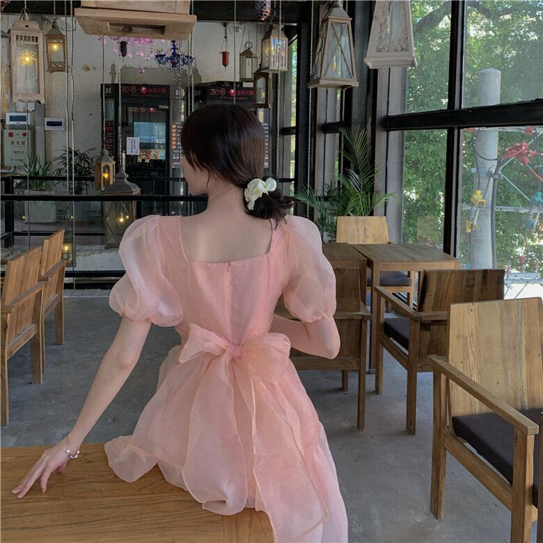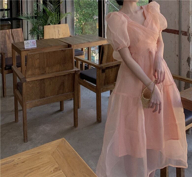 ピンクオーガン ドレス レディース 夏 ロングスカート ワンピース ワンピドレス ミモレ丈 半袖 バブルスリーブ Vネック Aライン シフォン リボン ウエストマーク バックリボン ハイウエスト 透け感 大人可愛い 大人女子 ラブリー キュート 無地 夏 謝恩会 結婚式 二次会 10代 20代 レディース OL 学生 パーティー イベント ホテル XS S M L ピンク