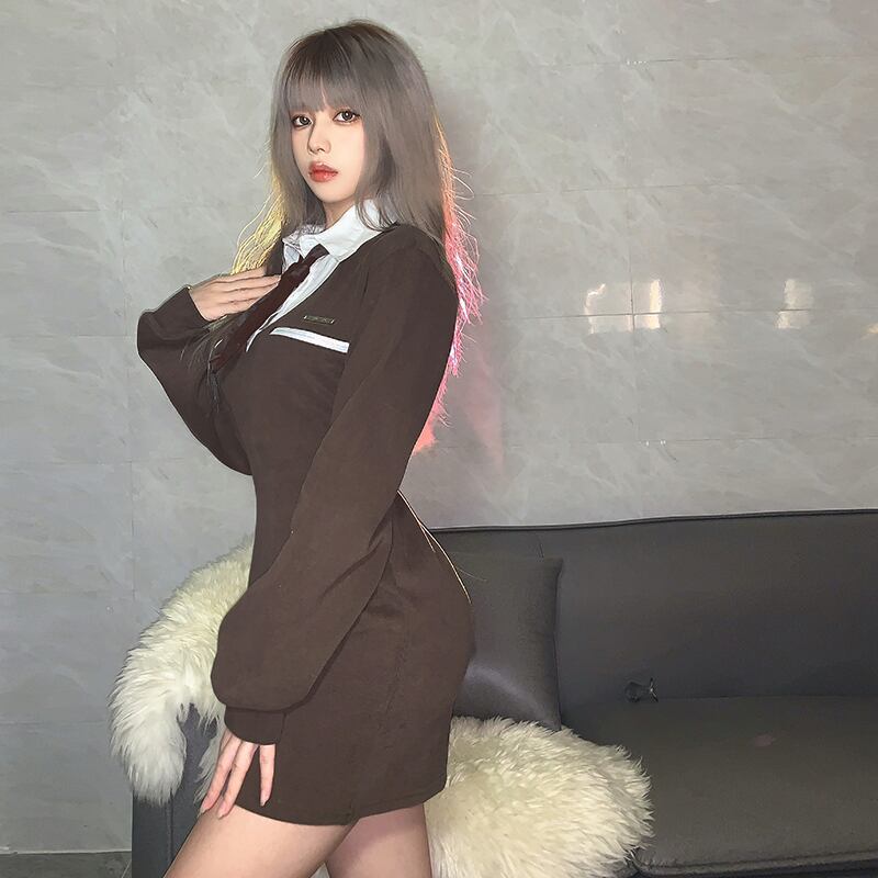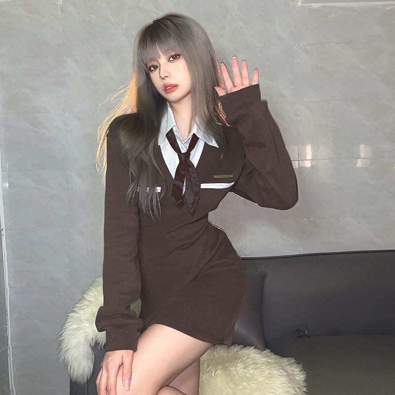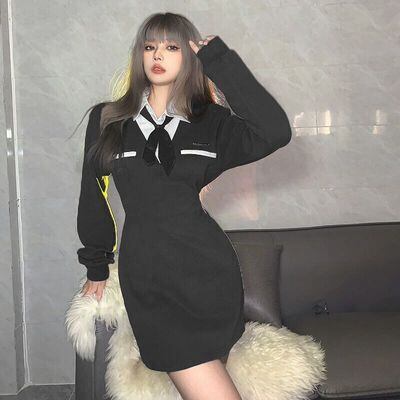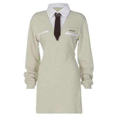 制服風 カレッジ 重ね着風 レイヤード風 ワンピース ミニ丈 膝丈 袖あり 長袖 襟付き Aライン 伸縮性 綿 かわいい カジュアル おしゃれ お洒落 ガーリー 無地 秋 10代 20代 レディース 女性用 女の子 学生 デート お出かけ 休日 普段使い お揃い 双子 楽ちん S M L 黒 ブラック 茶色 ブラウン ミントグリーン
