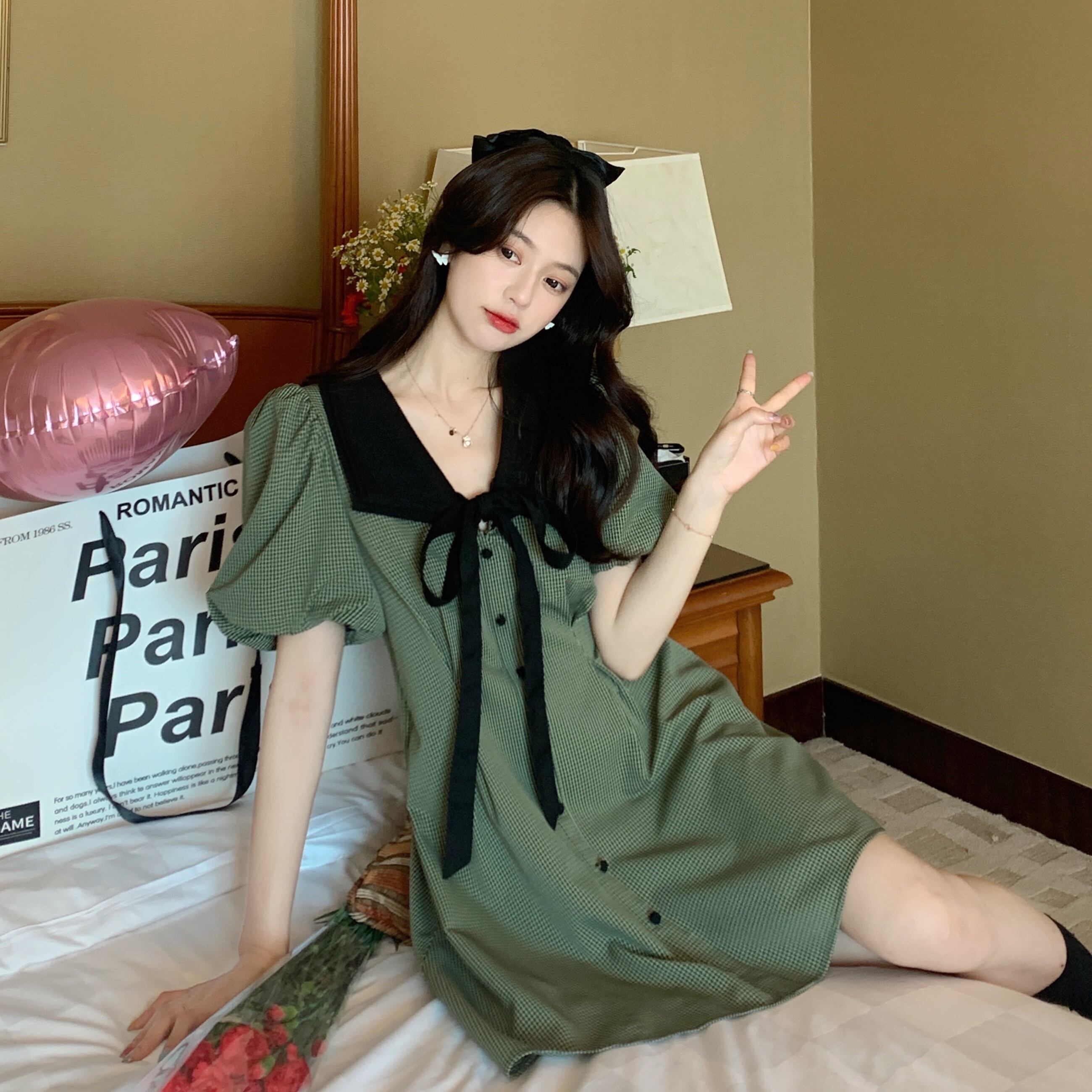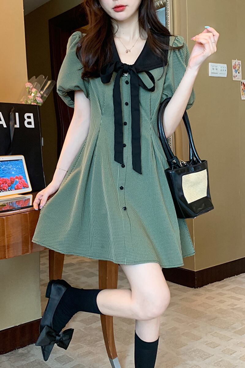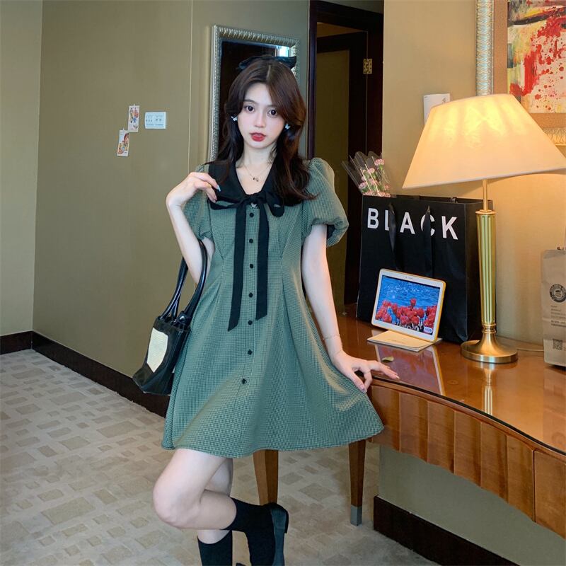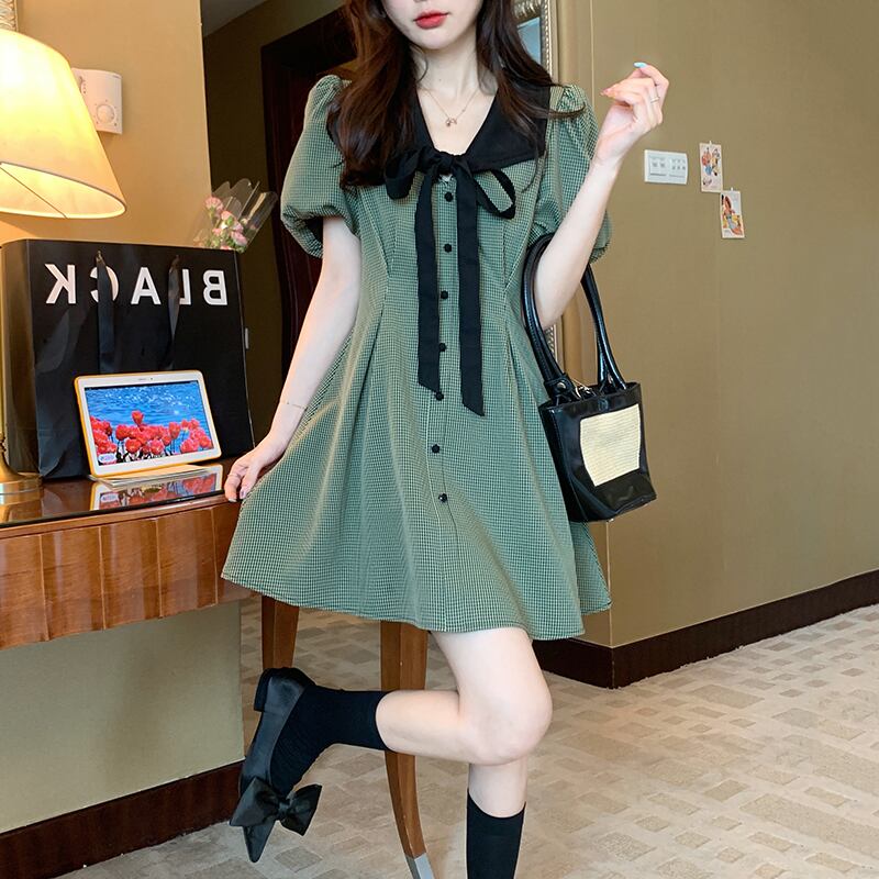 ビッグサイズ女性レトロ千鳥格スカートストリート夏スキニードレス ワンピース フレアワンピース ショート丈 ひざ丈 膝上 半袖 ボリューム袖 Vネック ストレート リボン ウエストマーク ハイウエスト 前開き 大人可愛い シンプル カジュアル 大人 おしゃれ レトロ 大人女子 ラフ ラブリー キュート ガーリー 格子柄 春 夏 10代 20代 OL 通勤 学生 通学 デート お出かけ 女子会 お泊まり 休日 旅行 普段使い S M L XL 2XL 3XL グリーン