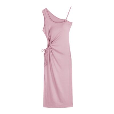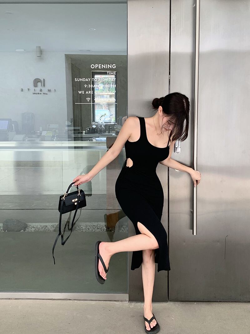 ワンピース 膝下 ミディアム丈 袖なし スリム タイト 細身 サイドスリット 伸縮性 シンプル こなれ感 セクシー 存在感 無地 夏 10代 20代 30代 40代 レディース 女性用 お出かけ 休日 リゾート 旅行 海 普段使い お揃い 双子 楽ちん フリーサイズ 黒 ブラック 青 ブルー 灰色 グレー ピンク