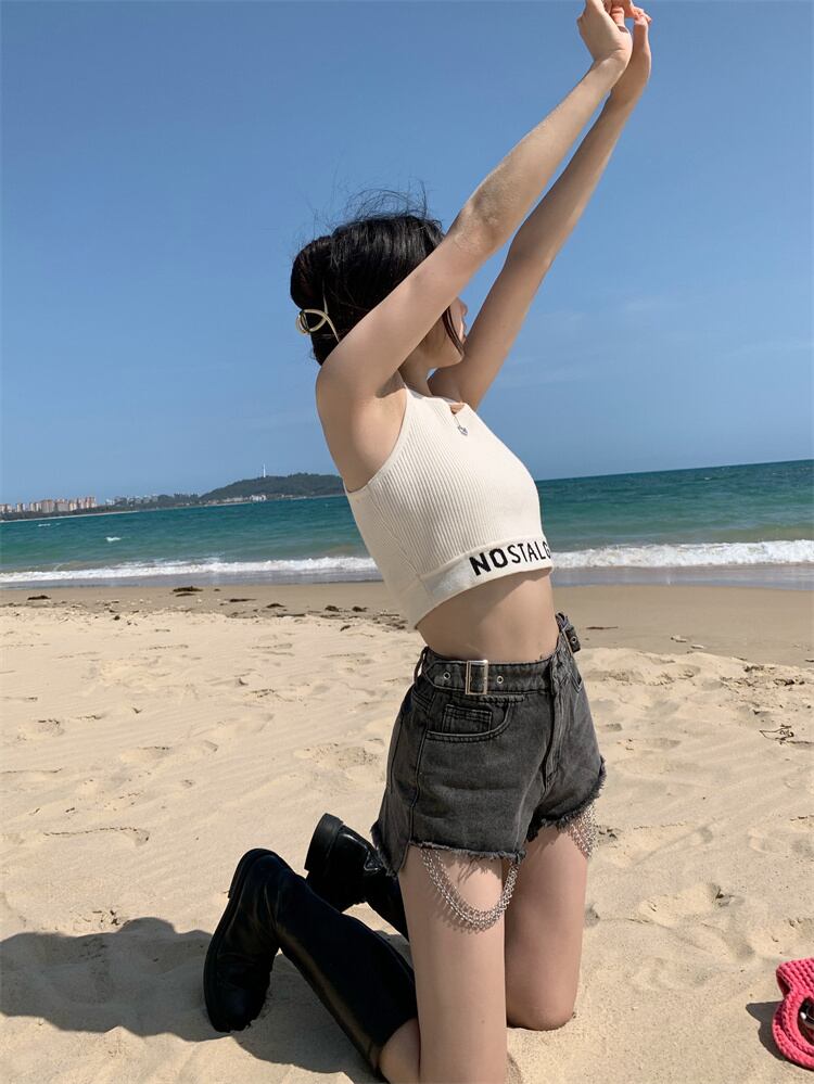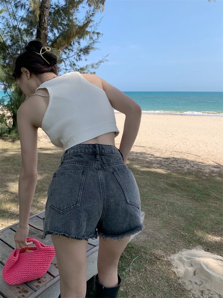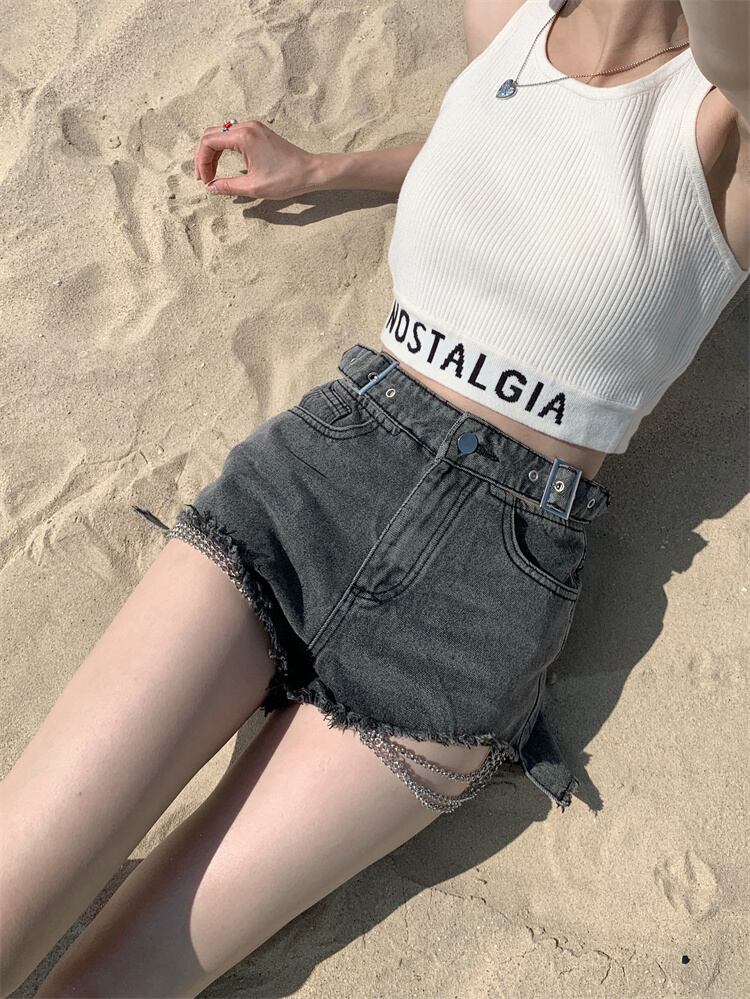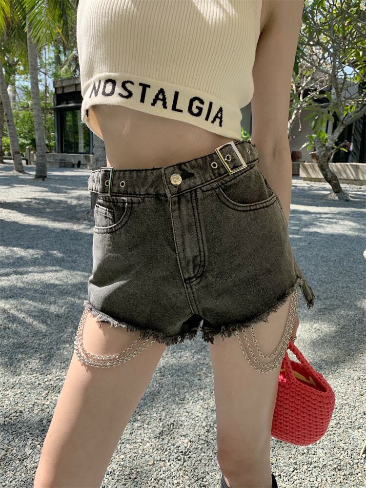 ダメージ加工 デニムショートパンツ チェーン付き ボトムス パンツ ベルト ハイウエスト デニム カジュアル おしゃれ お洒落 こなれ感 個性的 無地 春 夏 10代 20代 レディース 女性用 デート お出かけ 着回し 普段使い 美脚 脚長 XS S M L 黒 ブラック